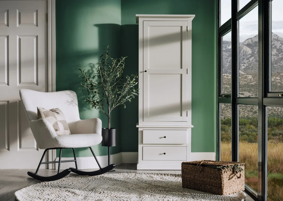 A beautifully designed wardrobe, the Atlas has two drawers for smaller item storage while hanging items can be kept dust free and tided behind a single door with panel trim finish.