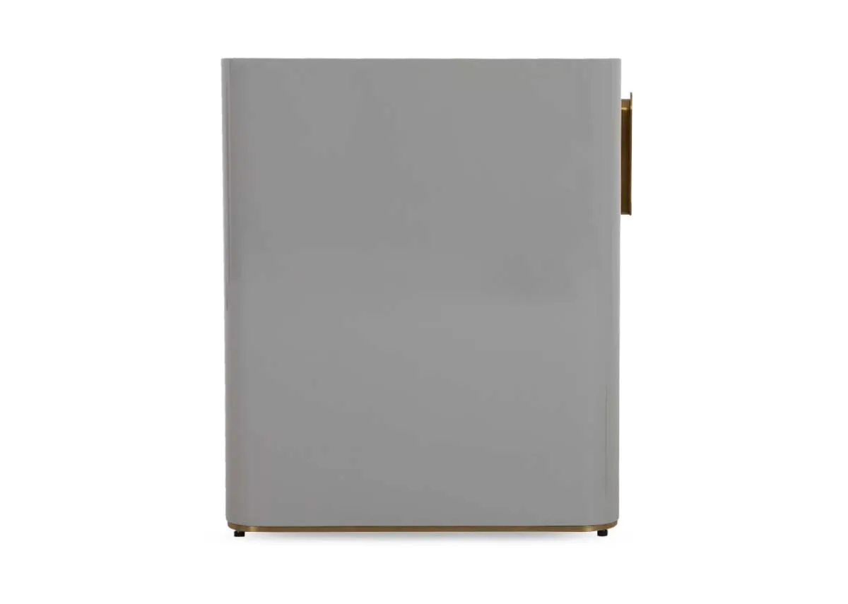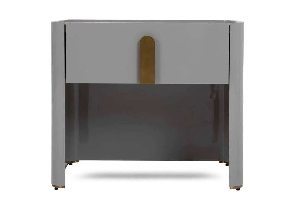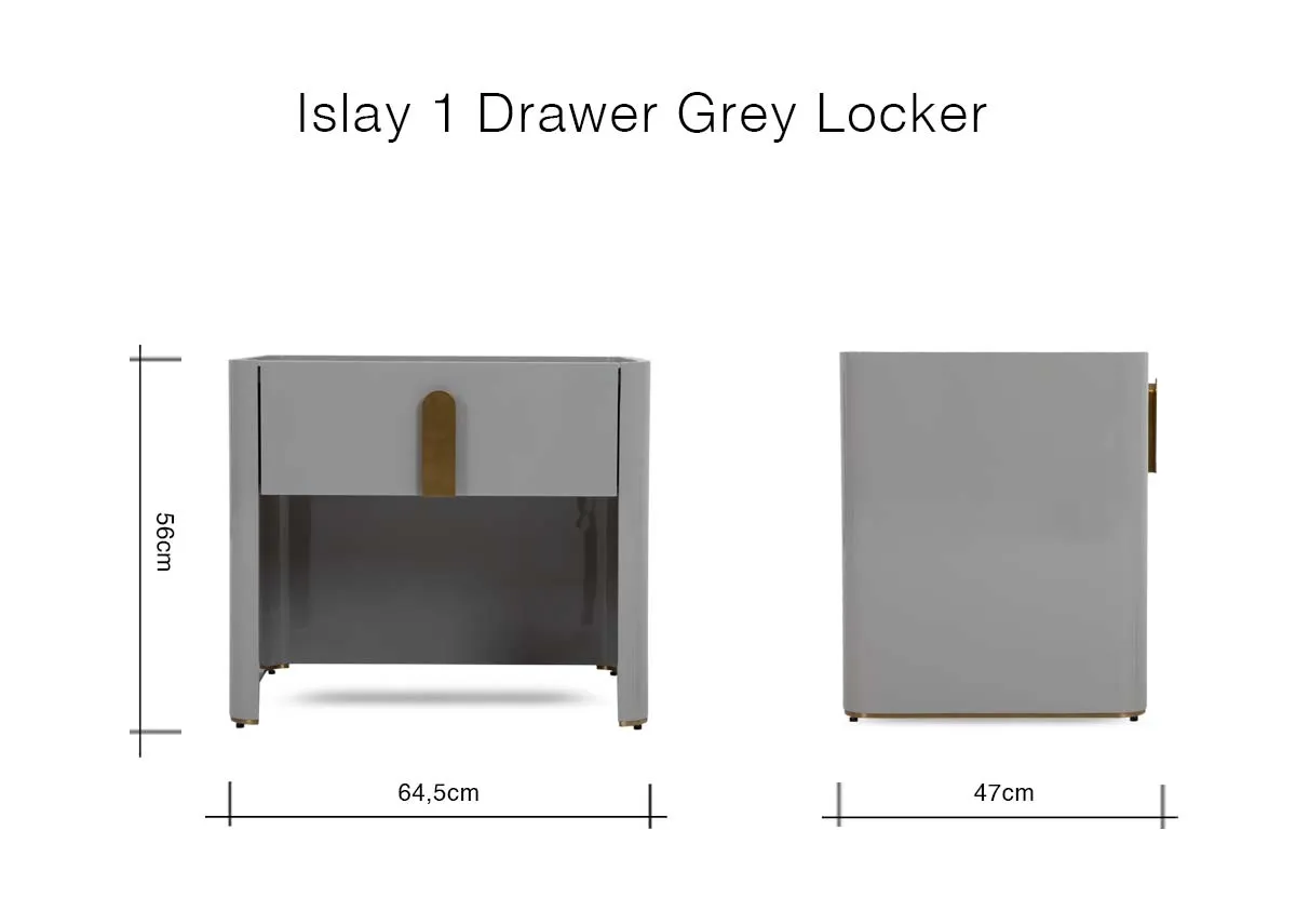 The curved islay locker with a walnut veneer tabletop, grey painted sides and back has 1 drawer for handy bedside storage.