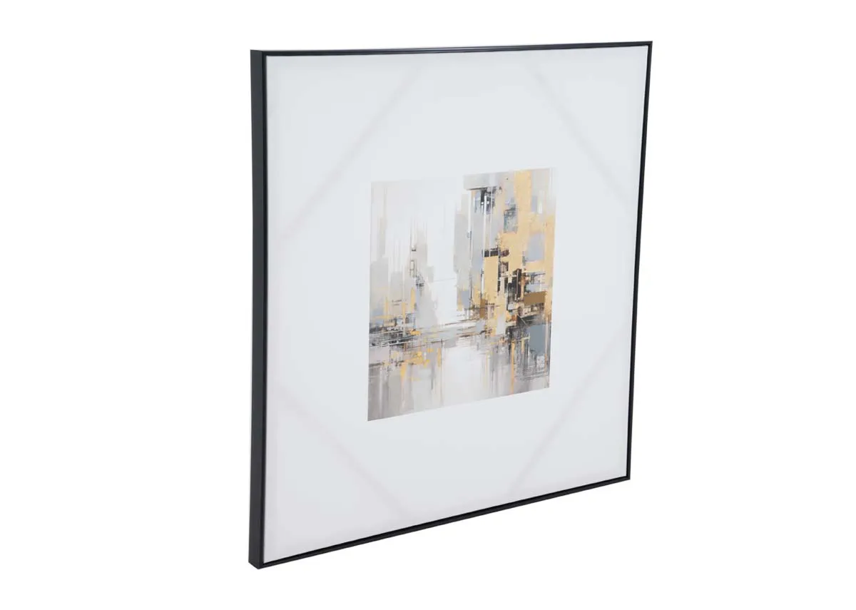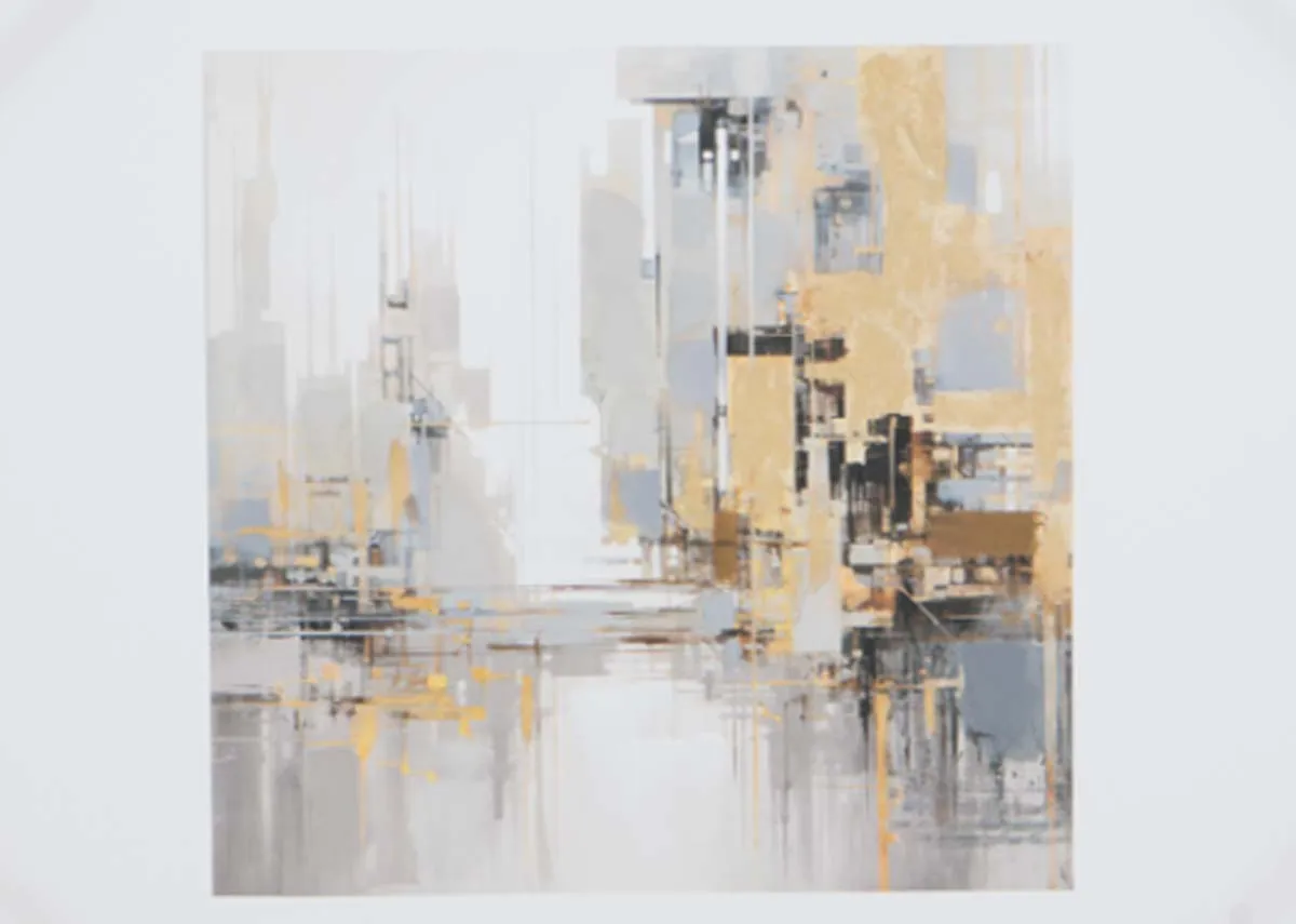 A moody picture of rooftops in muted tones of grey gold and white will bring instant city vibes into your home.