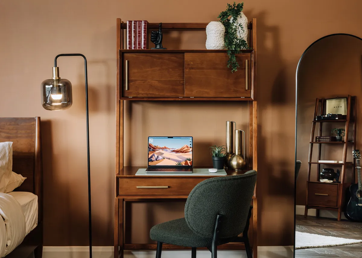Elevate your home office with the Leya Dark Pine Tall Desk, a perfect blend of stylish design and smart storage for a truly inspiring workspace.