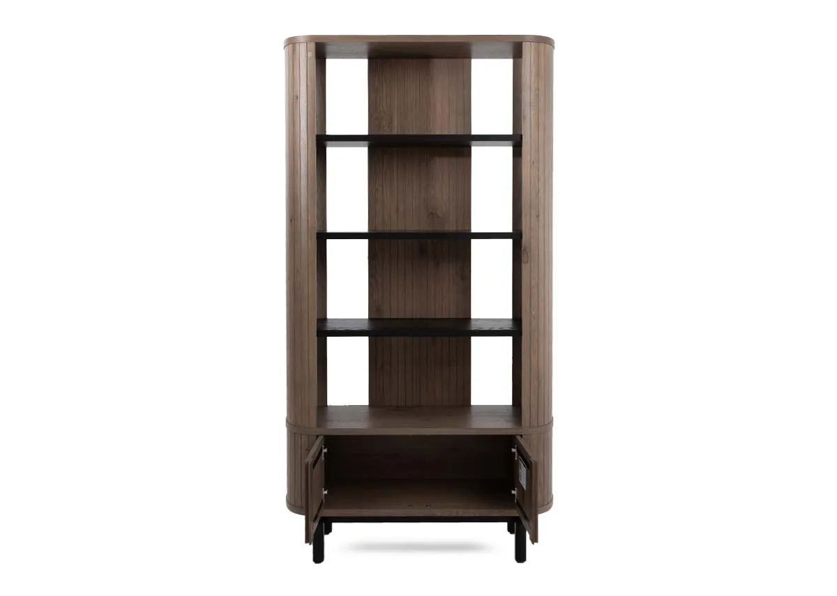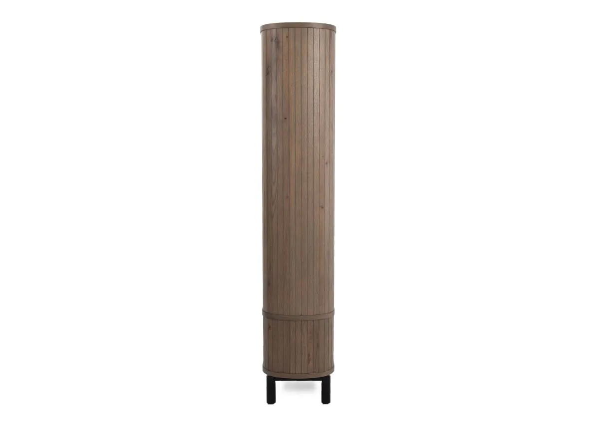 A curved 2 door display unit with grey oiled veneer and wire brushed oak with 4 shelves for exhibiting your favourite decorative pieces.