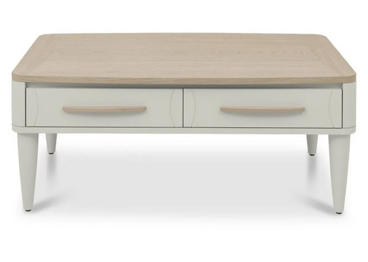 Elevate your living space with the Larsen 2-Drawer Coffee Table, featuring a chic Scandi-inspired design with practical storage in a beautiful oak and soft grey finish.
