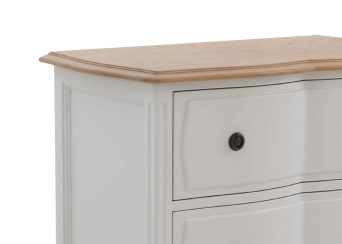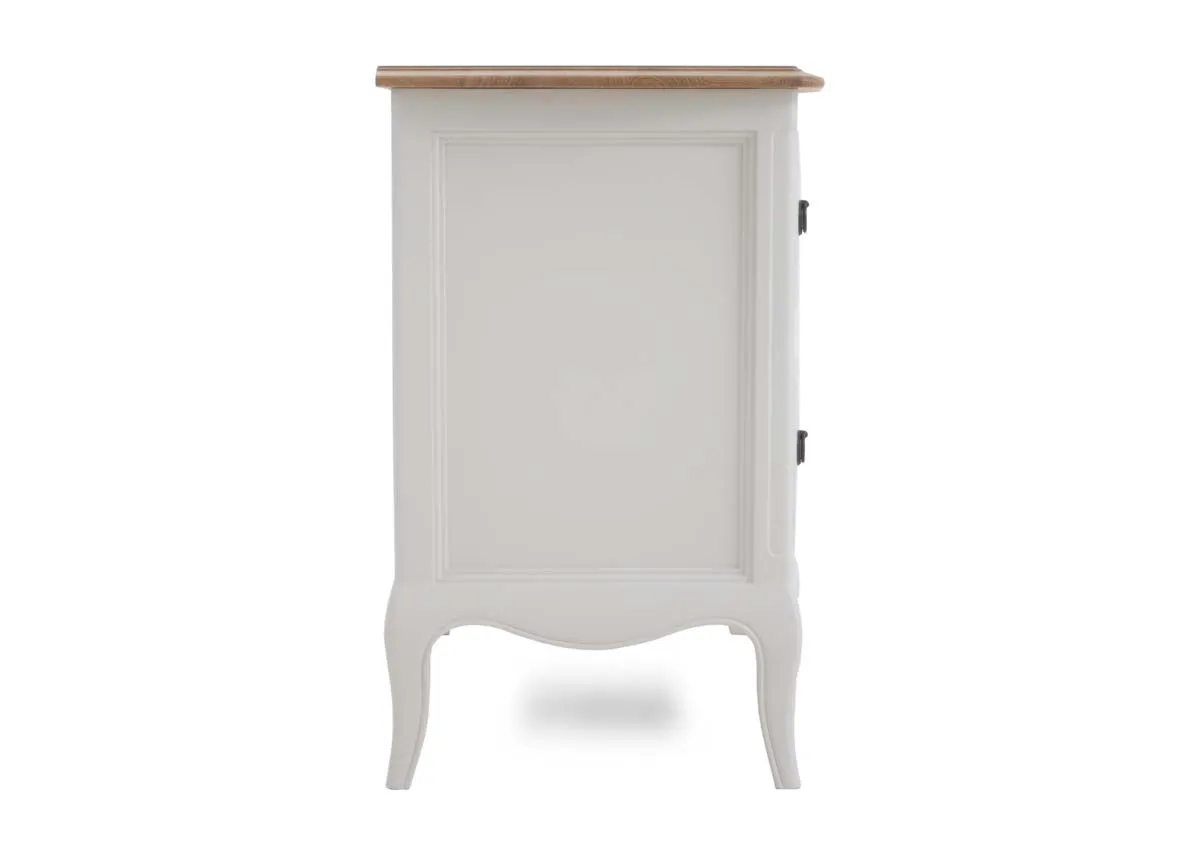 Elevate your bedroom with the Amelie 2-drawer locker, a beautifully crafted piece boasting classical French curves and a charming white and limewashed oak finish.