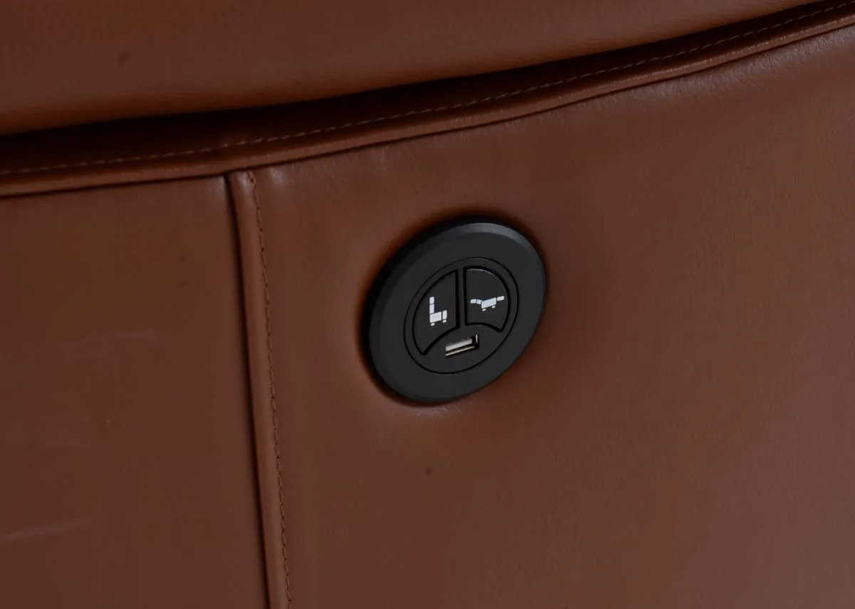 A brown soft leather 2.5 seater sofa with power reclining functions with seat cushions made of high-density foam wrapped in hypoallergenic dacron and supported by pocket springs.