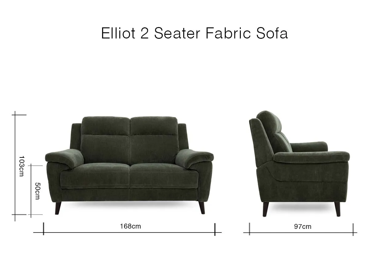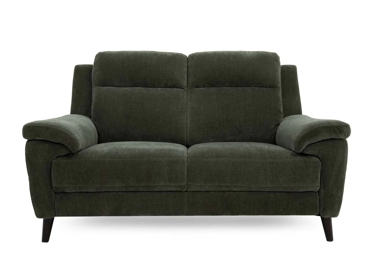A green fabric fixed sofa with wood feet and 10 year frame warranty.