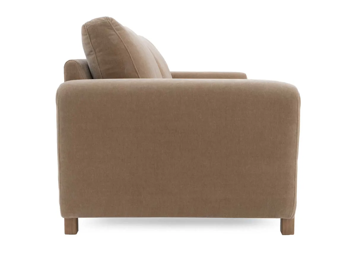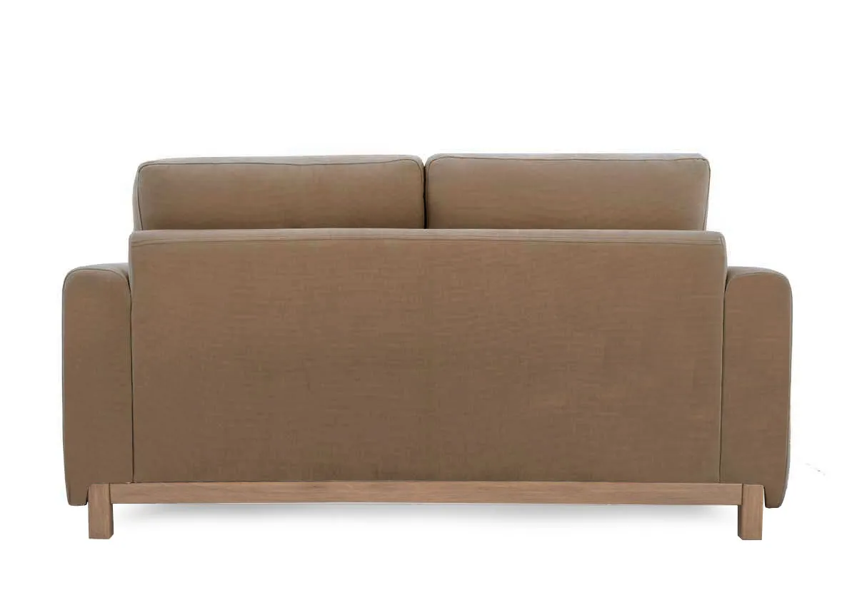 A retro mink 2 seater sofa in soft fabric with an ashy oak wood frame visible in the front and high legs.