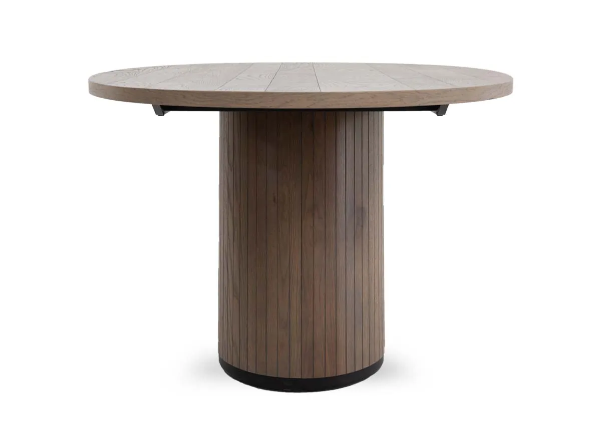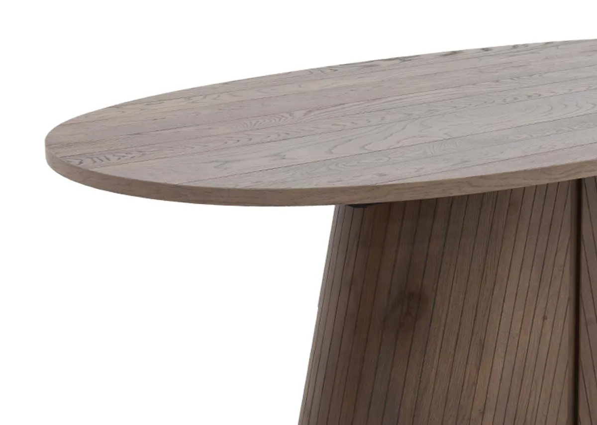 An oval 200cm dining table with grey oiled veneer and wire brushed oak finish tabletop with wide pedestal base.