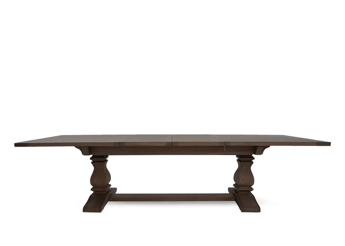 An extendable wood dining table in vintage grey ash with an inlaid pattern top & elegant legs.
