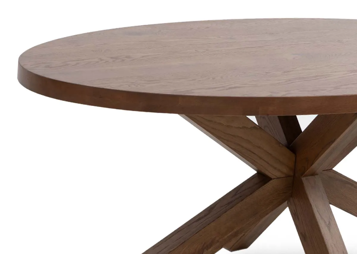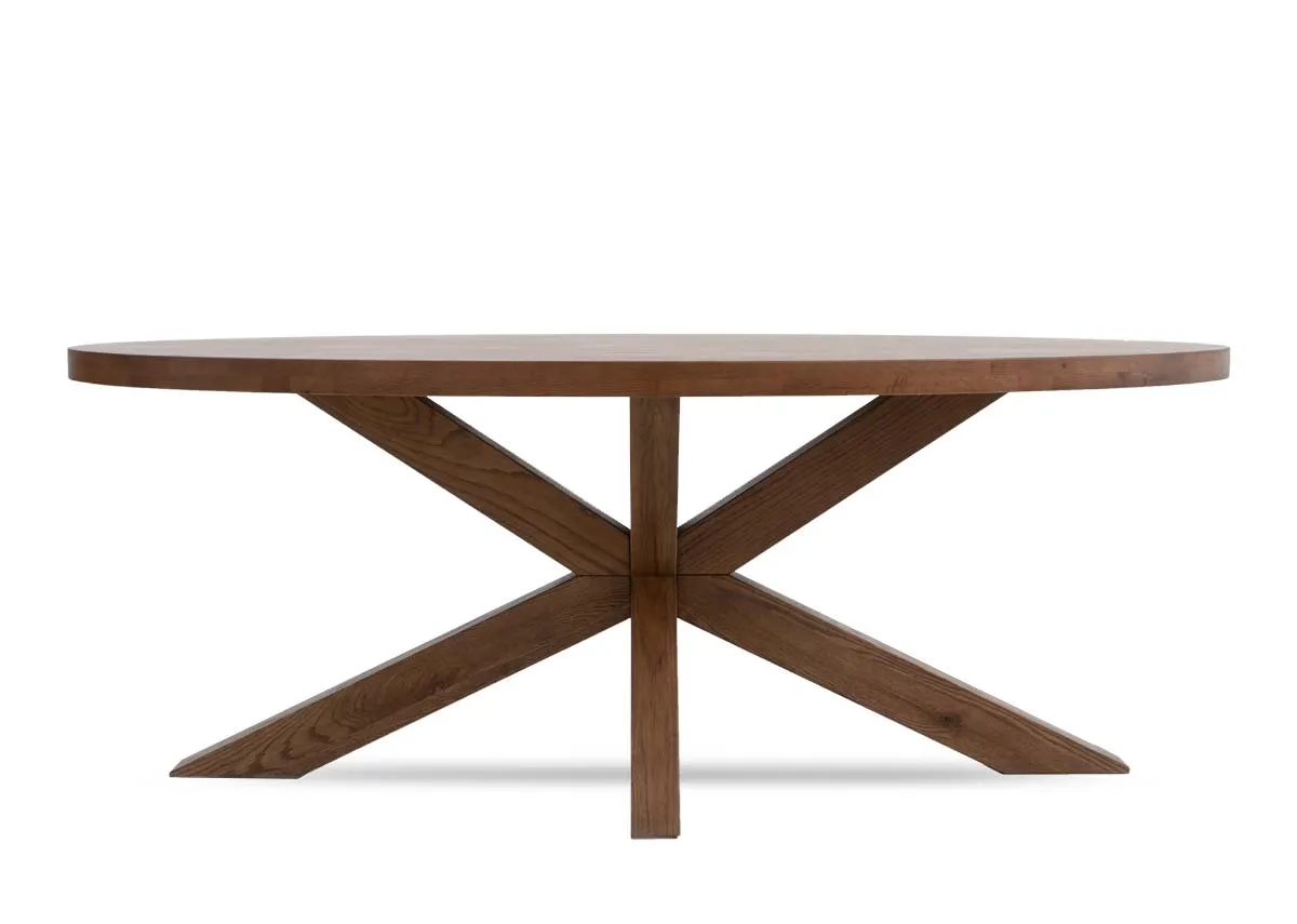 A rustic solid oak dining table boasting an oval shape, with sturdy oak cross .legs, this dining table is a timeless piece.