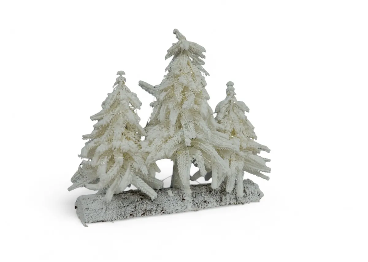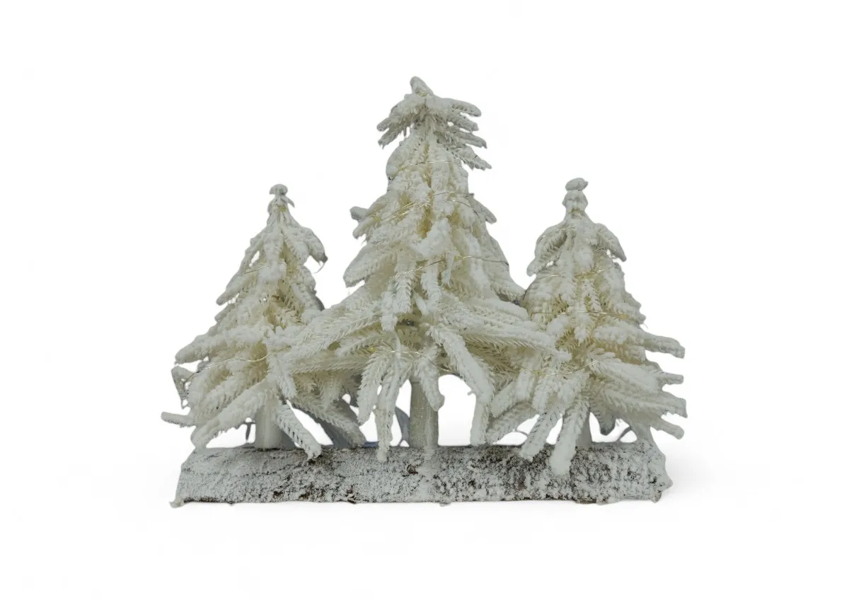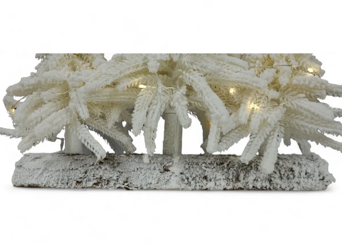This gorgeous Elsie 26cm Snow Ornament with lights displays 3 small seasonal pine trees with a snowy finish on a wood base.