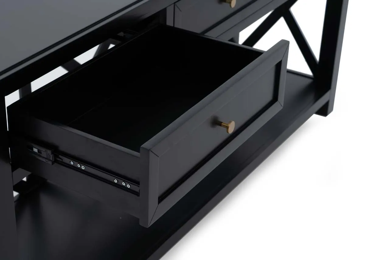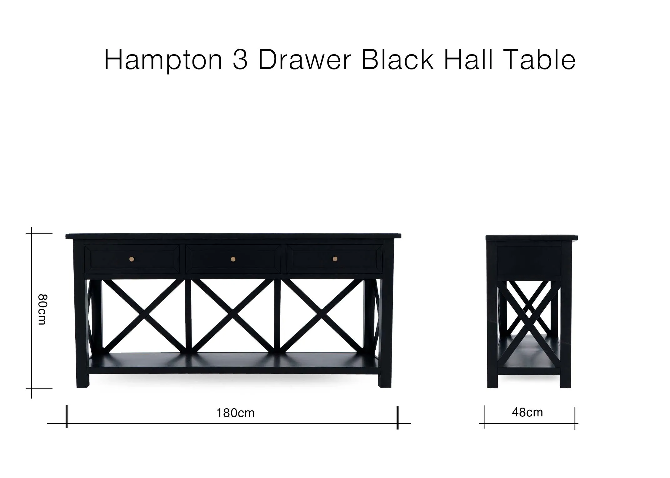 The Hampton black hall table has a pine frame, a glass top with 3 small drawers for storage and ample shelf storage underneath.