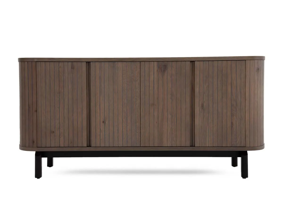 A curved wide sideboard with 4 doors and 2 discreet drawers all boasting grey oiled veneer and wire brushed oak finish with metal legs.