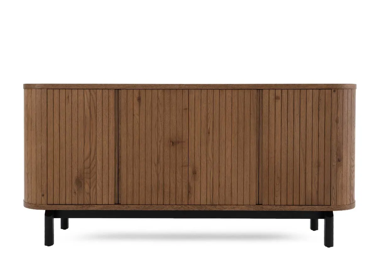 A curved wide sideboard with 4 doors and 2 discreet drawers all boasting a rustic oak and wire brushed finish with metal legs.
