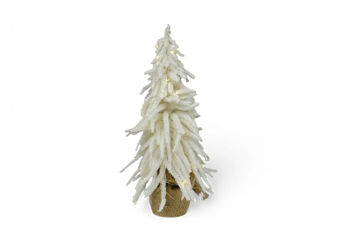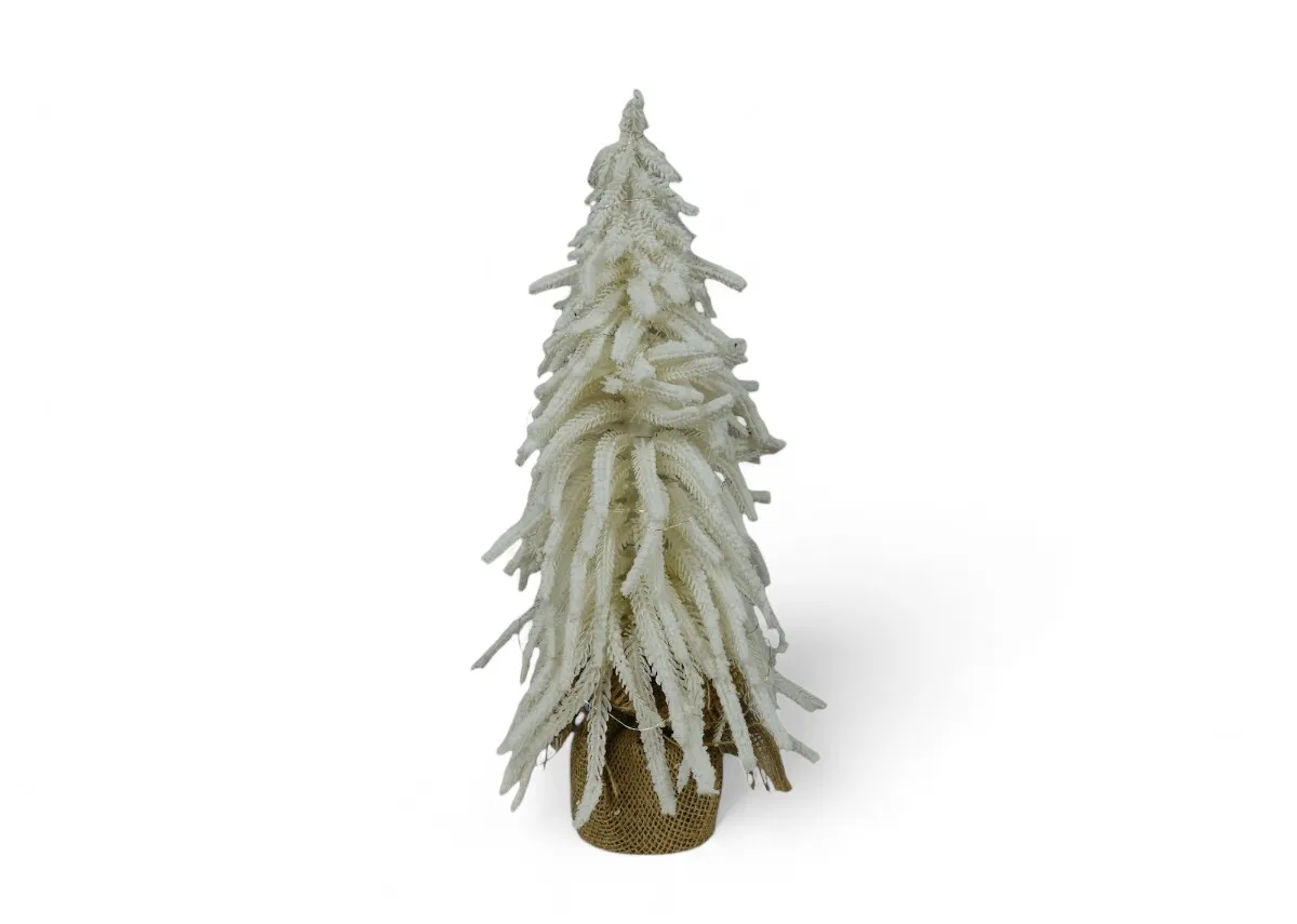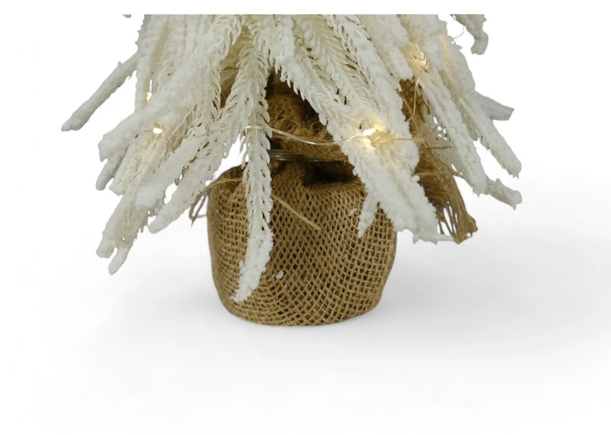 Add ambience with this gorgeous Elsie 45cm Snow Tree Ornament with lights displaying seasonal pine with a snowy finish n a small jute pot.