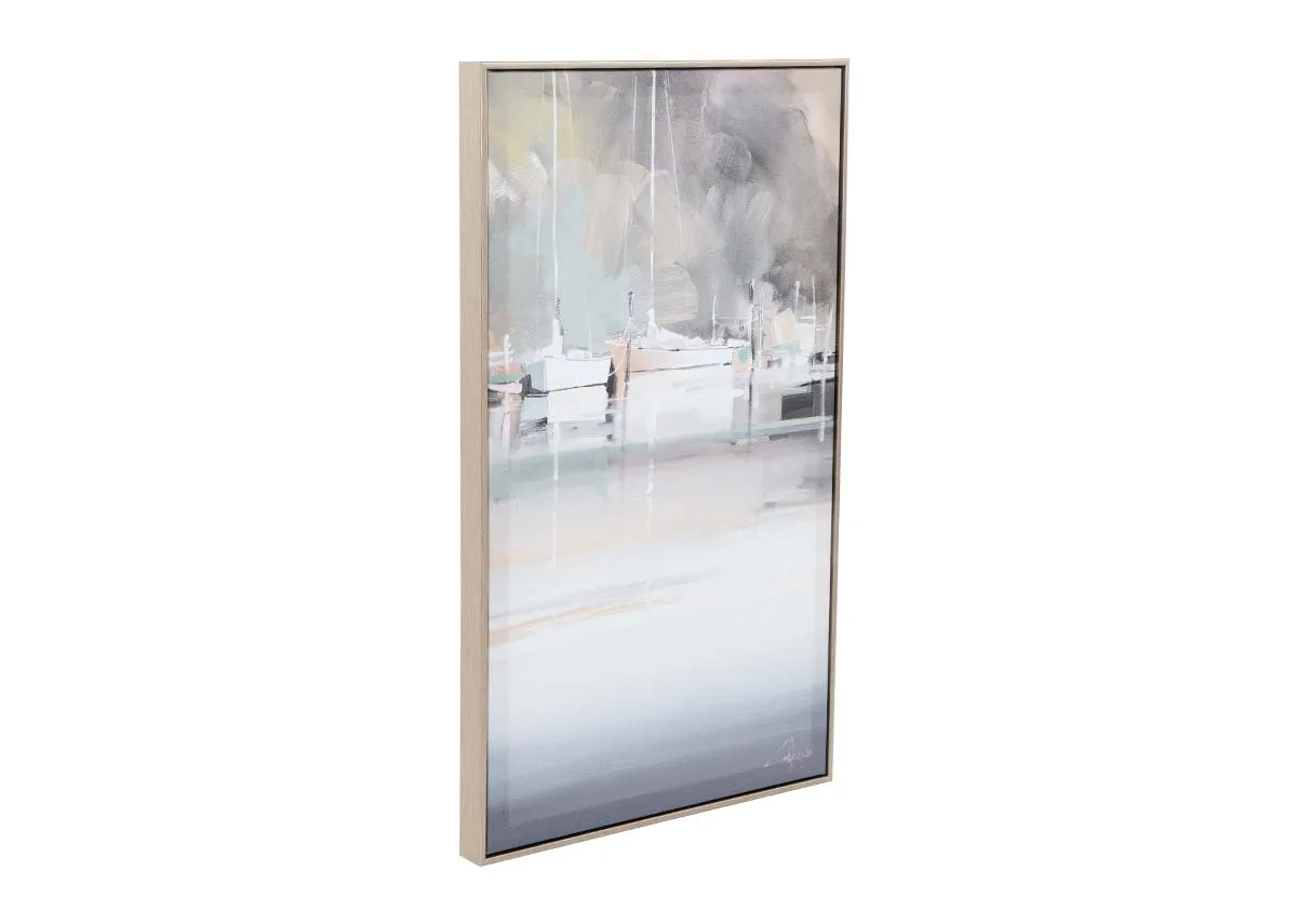 A muted mooring scene with pastel and grey shades depicting boats and a moody sky the ideal print to feature in your living, dining or bedroom space.