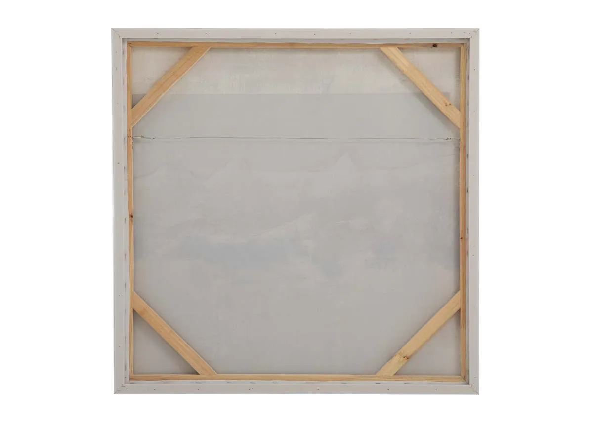 A wooden grain canvas oil picture of a mountainscape in mist with very subtle greys and nude tones.