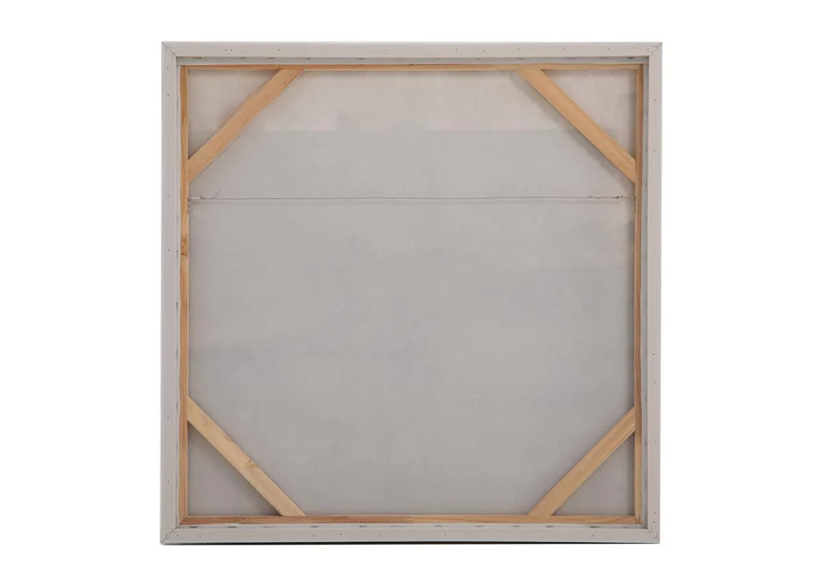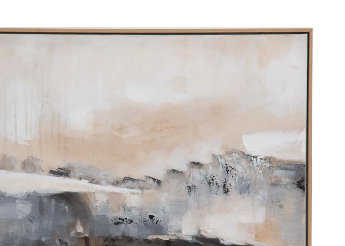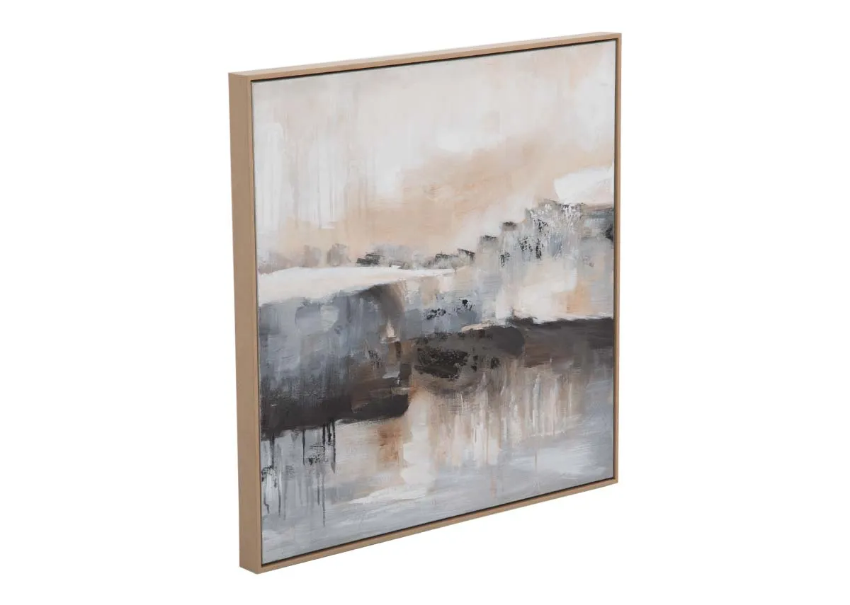 A wooden grain canvas oil picture of a mountainscape in mist with very subtle greys and nude tones with darker waterfront reflection.