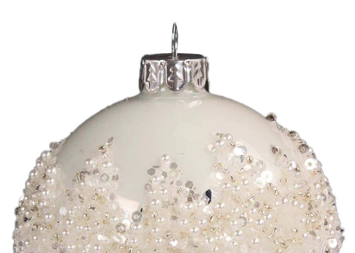 Glamorous white glass 8cm bauble with faux pearls, diamantes, and sequins.