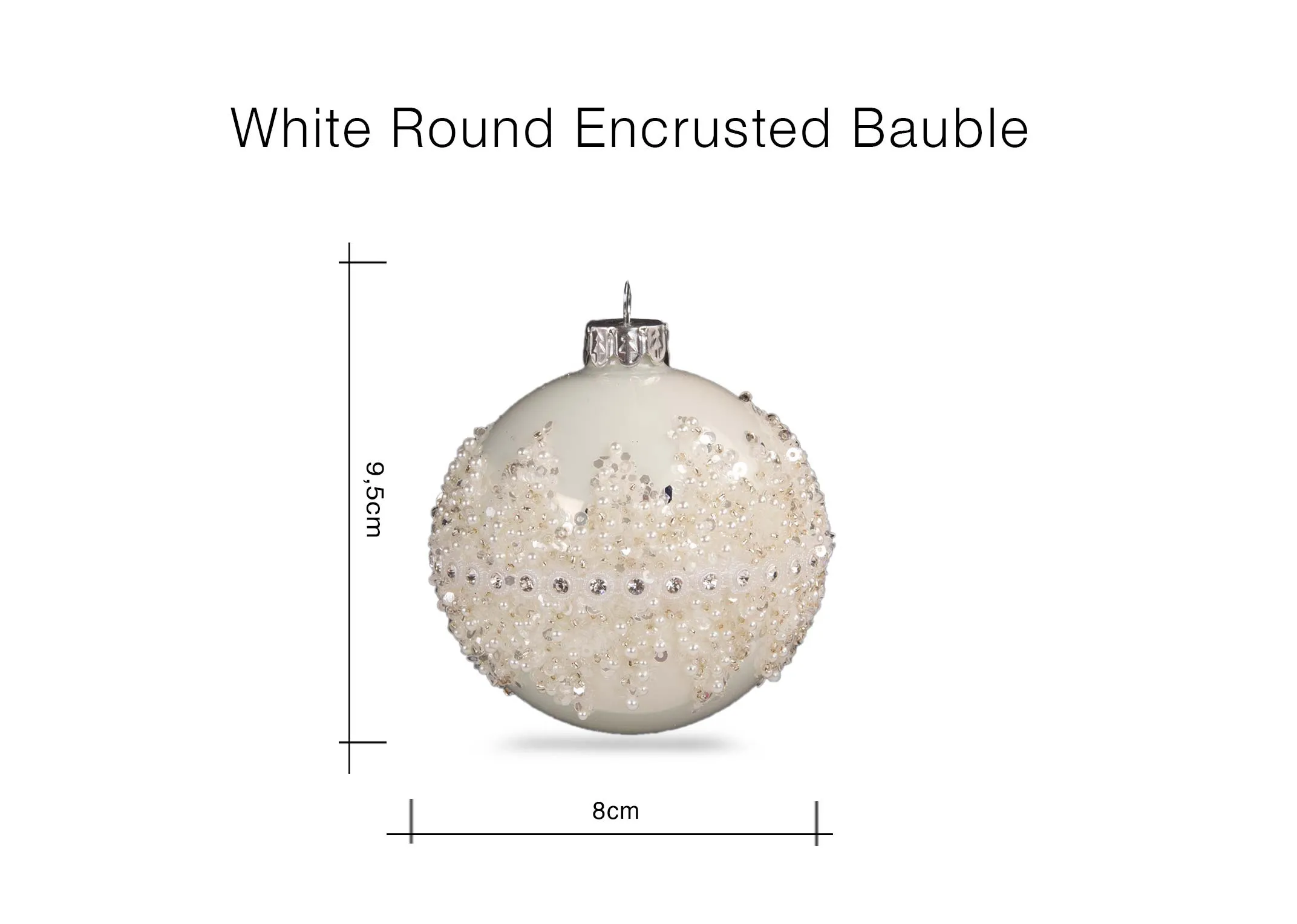 Box of 6 8cm White Round Encrusted - Christmas Bauble