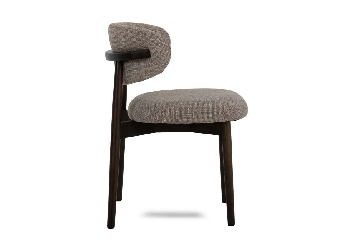 A fine example of mid-century inspired design, the Hazel dining chair boasts a wooden frame with dark finish and beige upholstery.