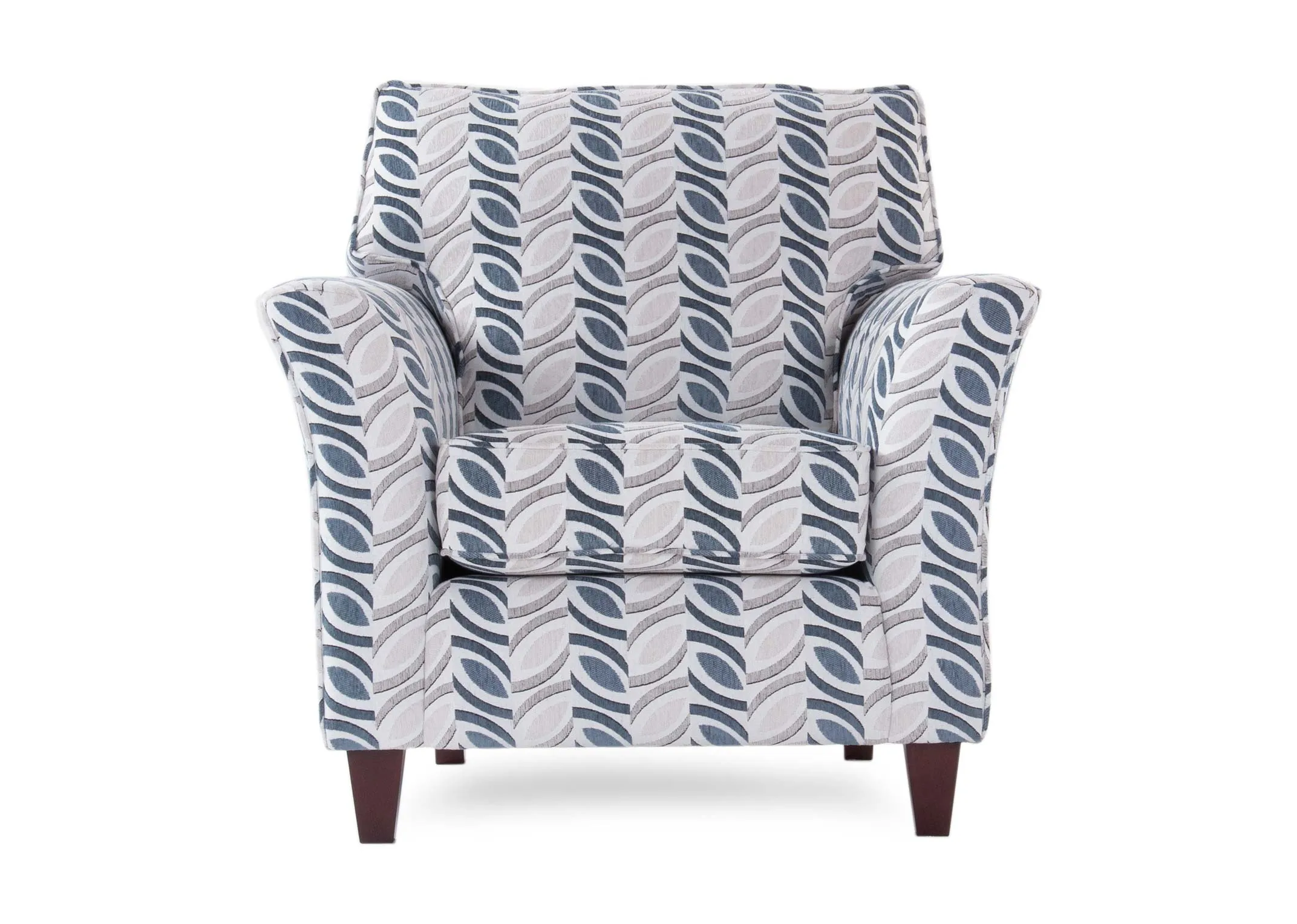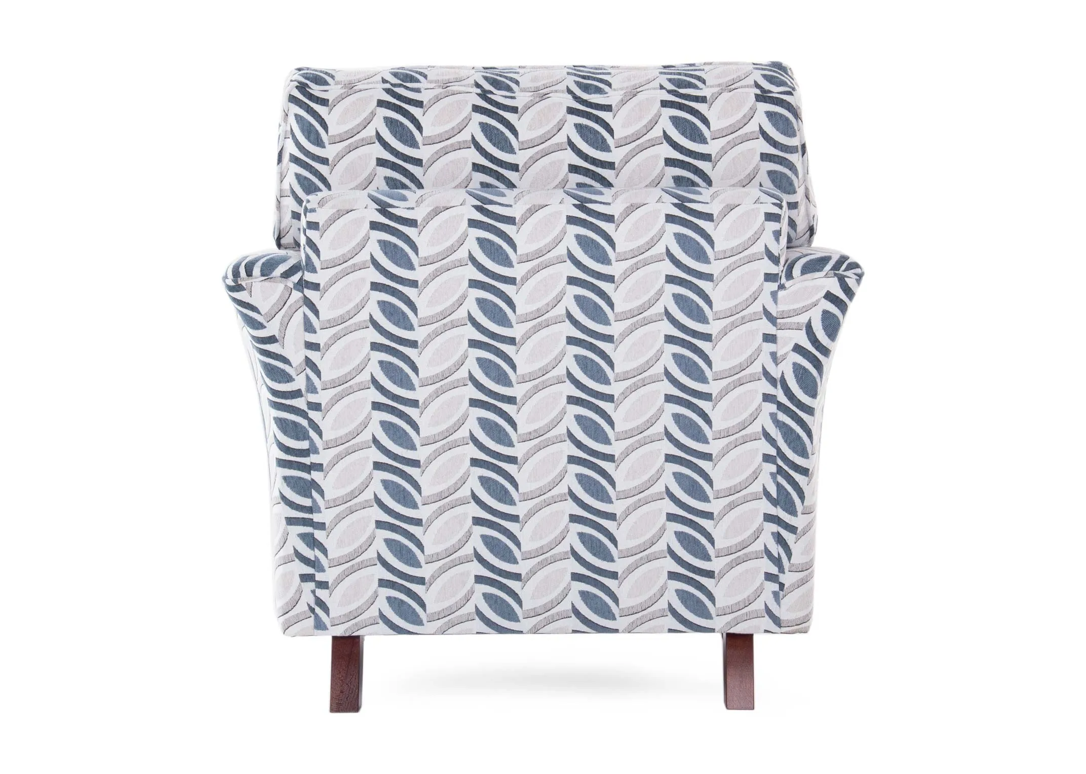 The Kilronan blue accent chair is a statement piece with striking patterned fabric, dark wooden feet, and a timeless design.