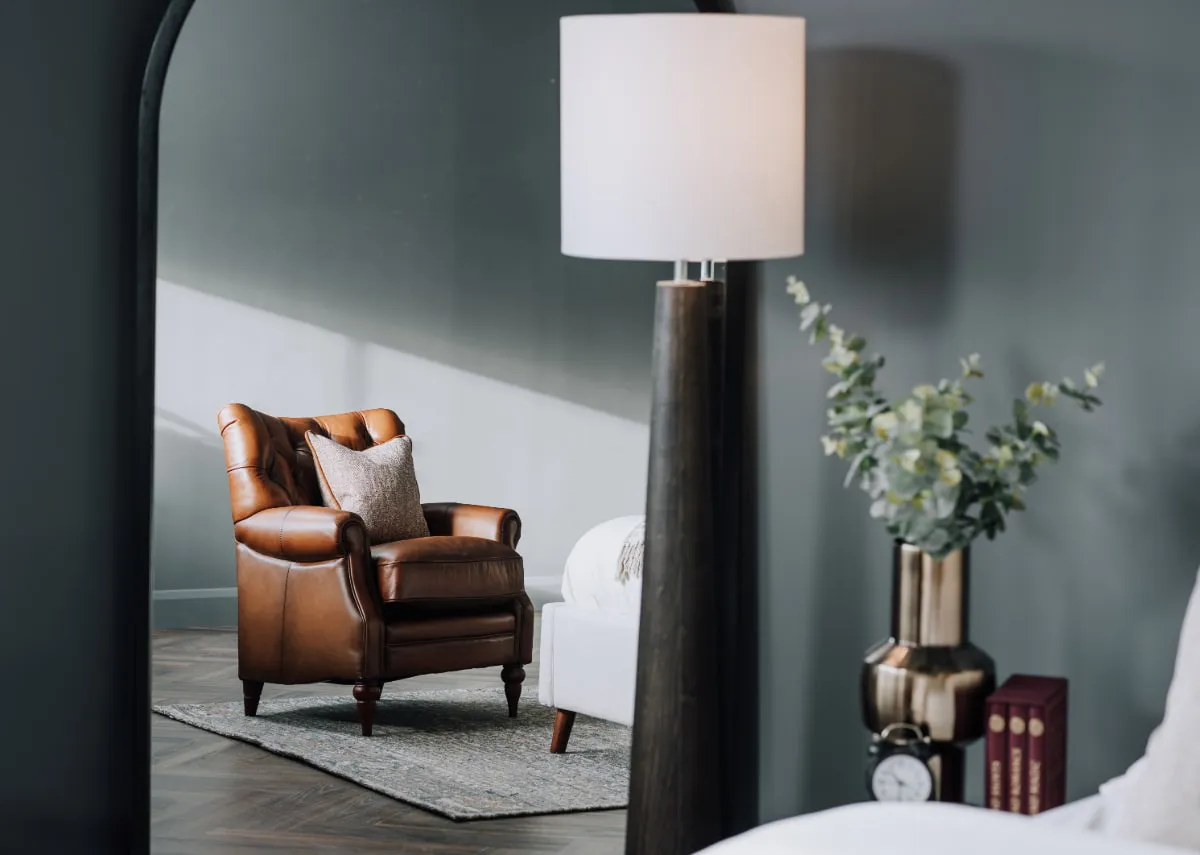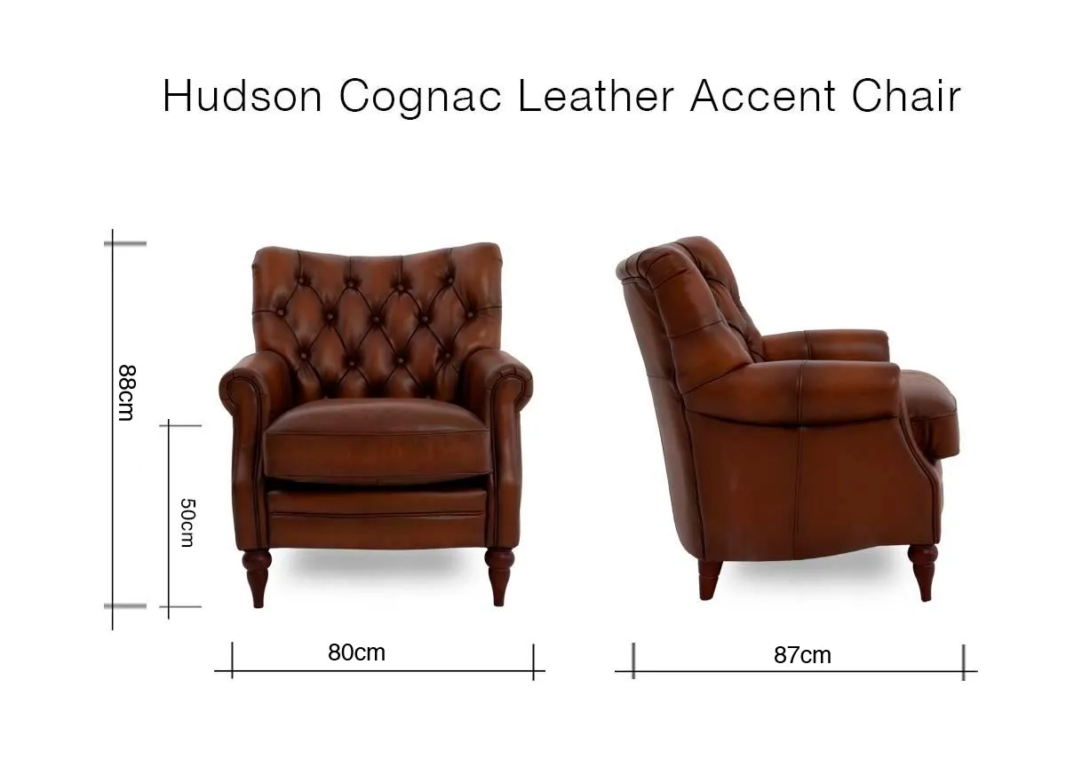 The Hudson is an accent chair with tufted button back upholstered in a real vintage cognac brown leather and boasts feather filled cushion seats.