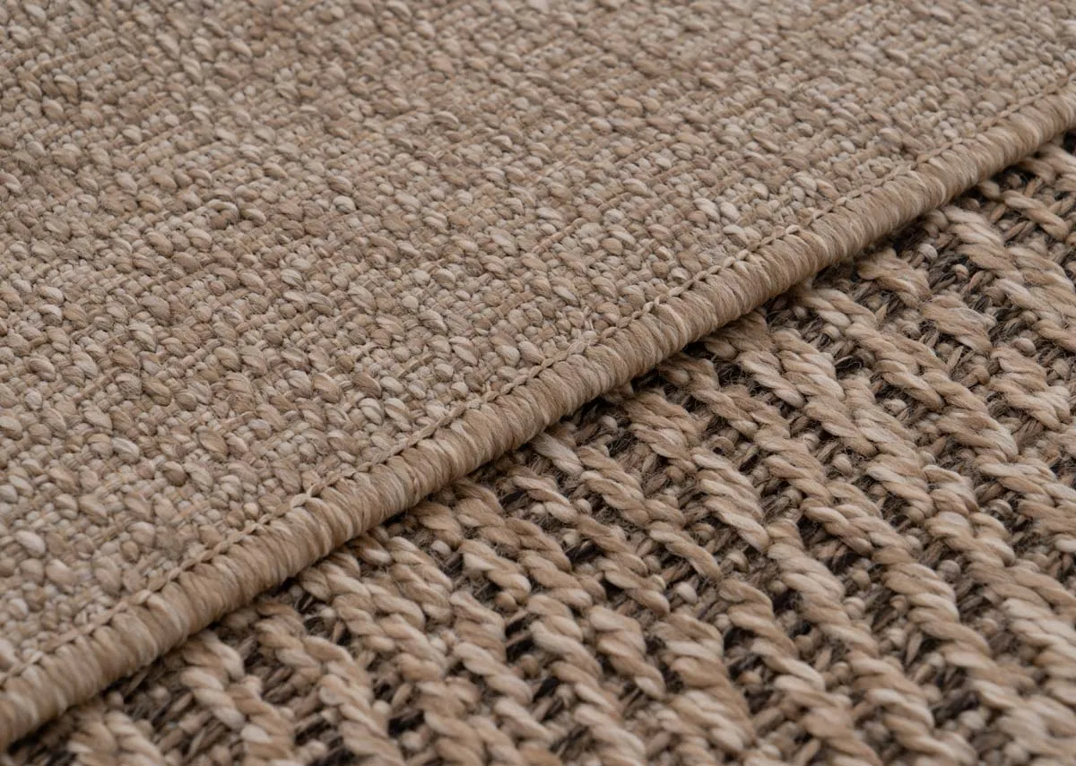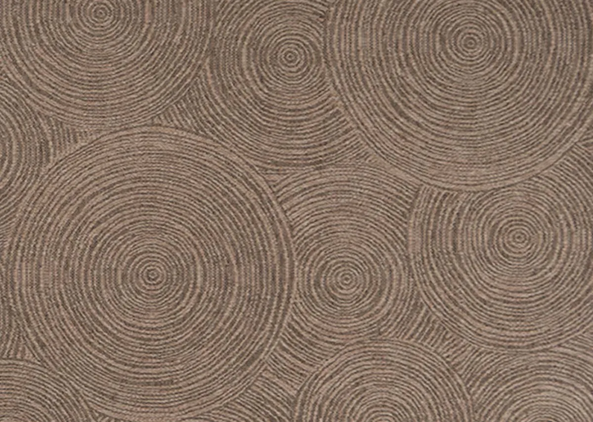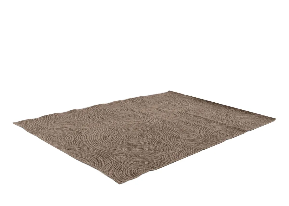 A textured brown woven rug with a cicrular swirl pattern suitable for indoor and outdoor areas.