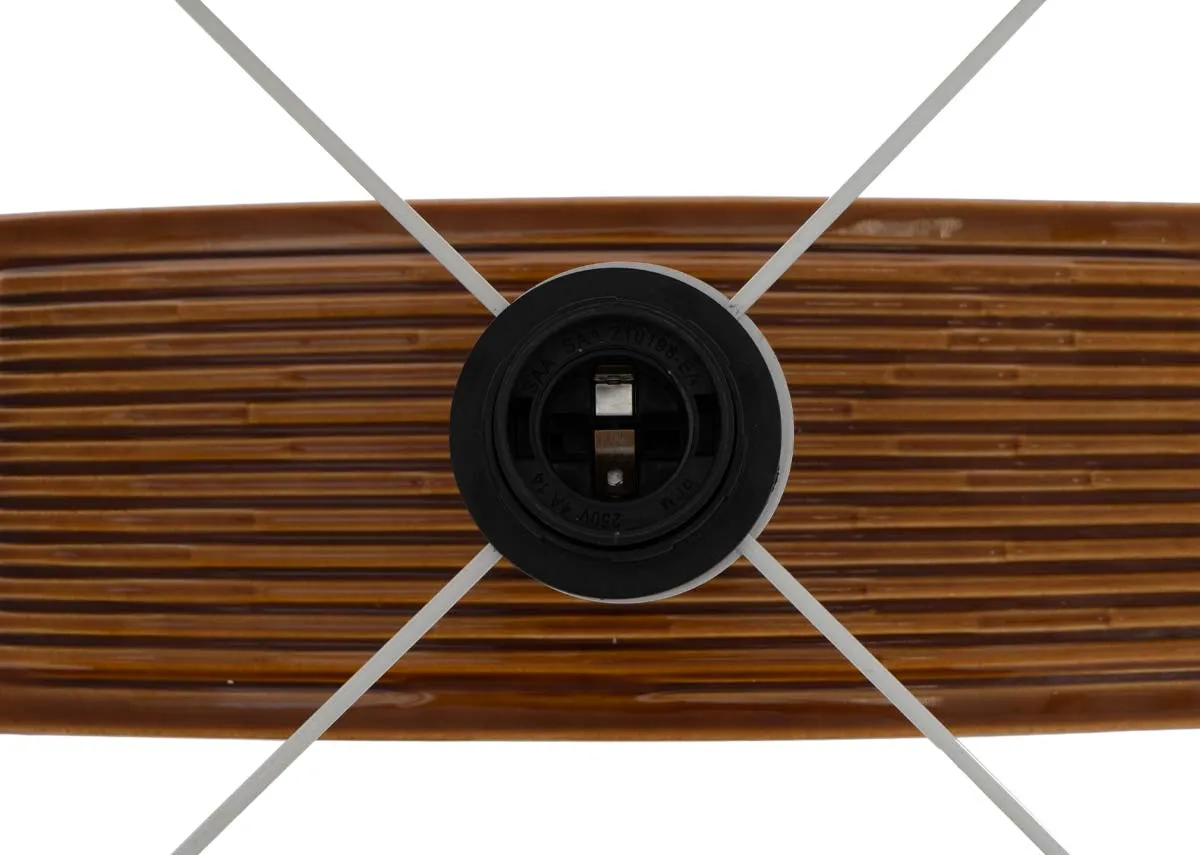 The Dee table lamp boasts a ceramic base with a glossy brown earthy hue together with an off-white drum shade.
