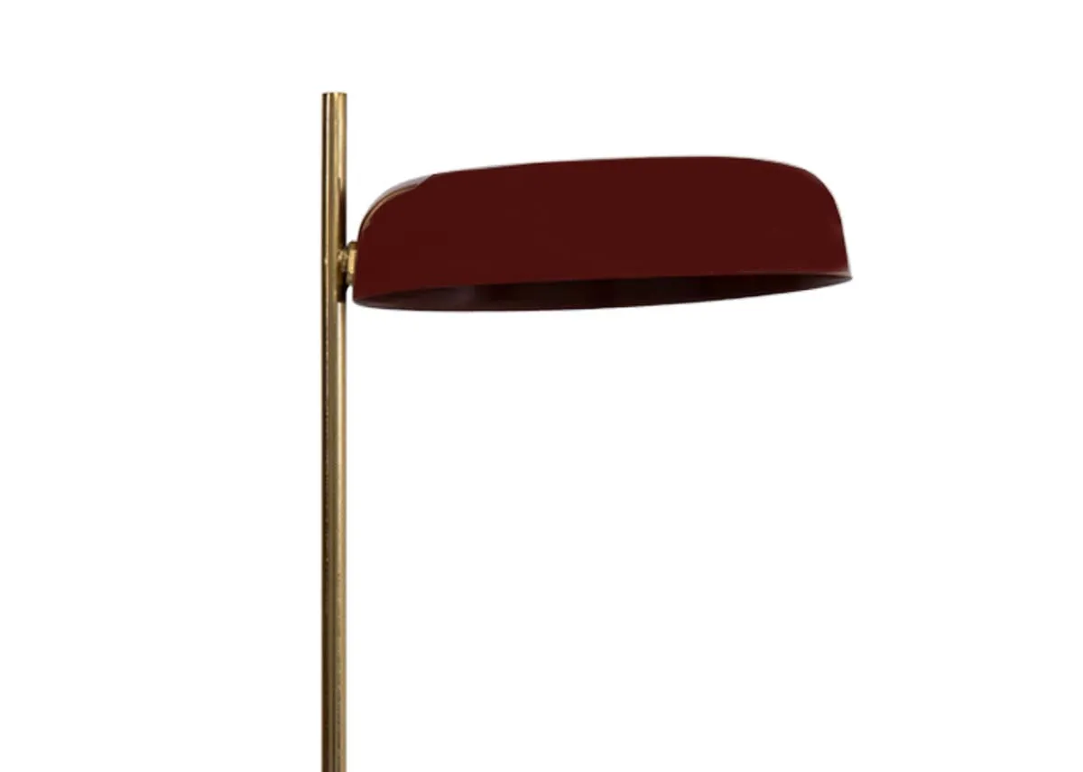 The Maleka lamp is a striking piece with a retro flair boasting a burgundy metal cap shade and gold stand.