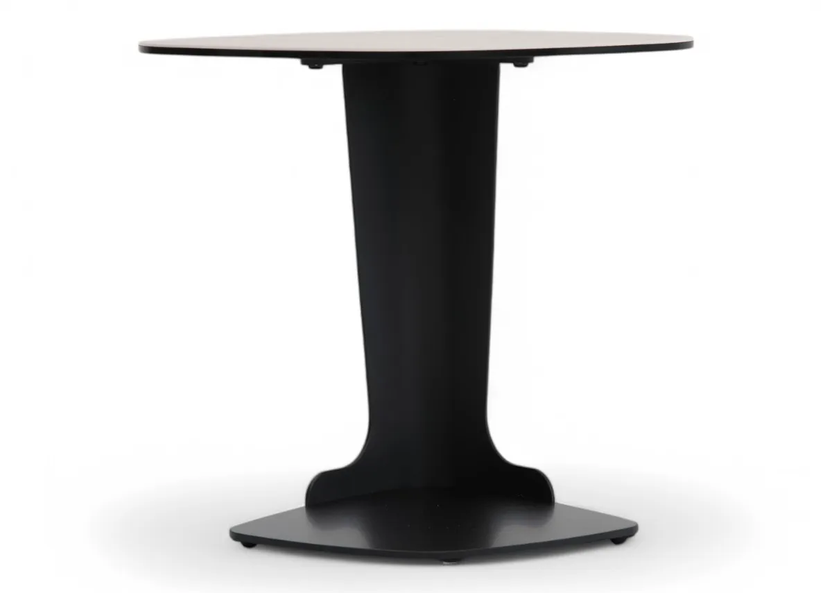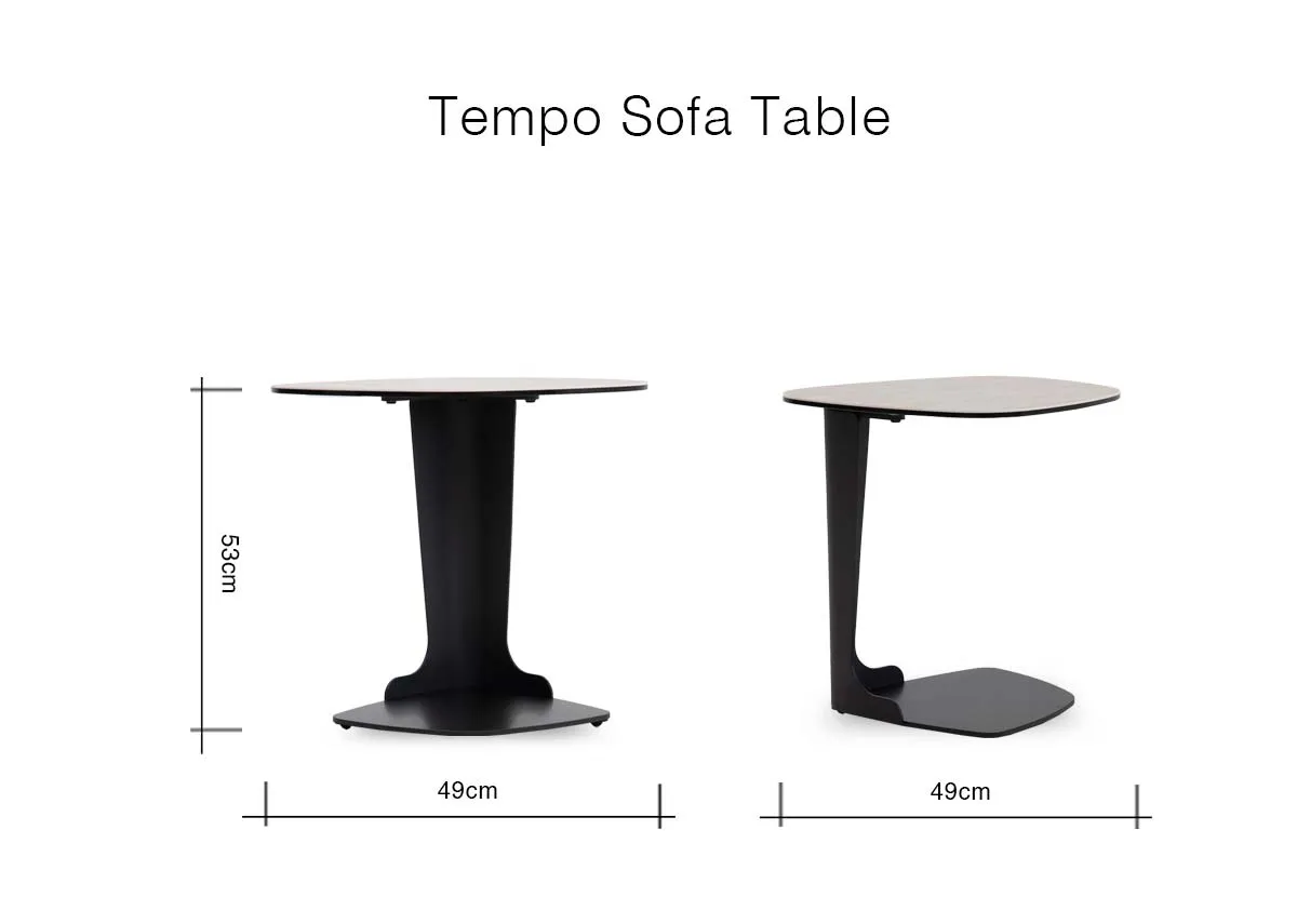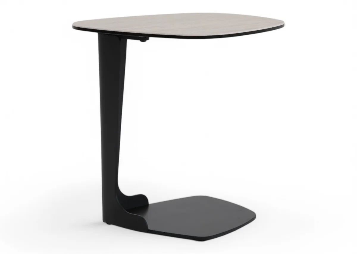An oblong offset side table with cream ceramic top and dark grey powder coated metal curved legs.