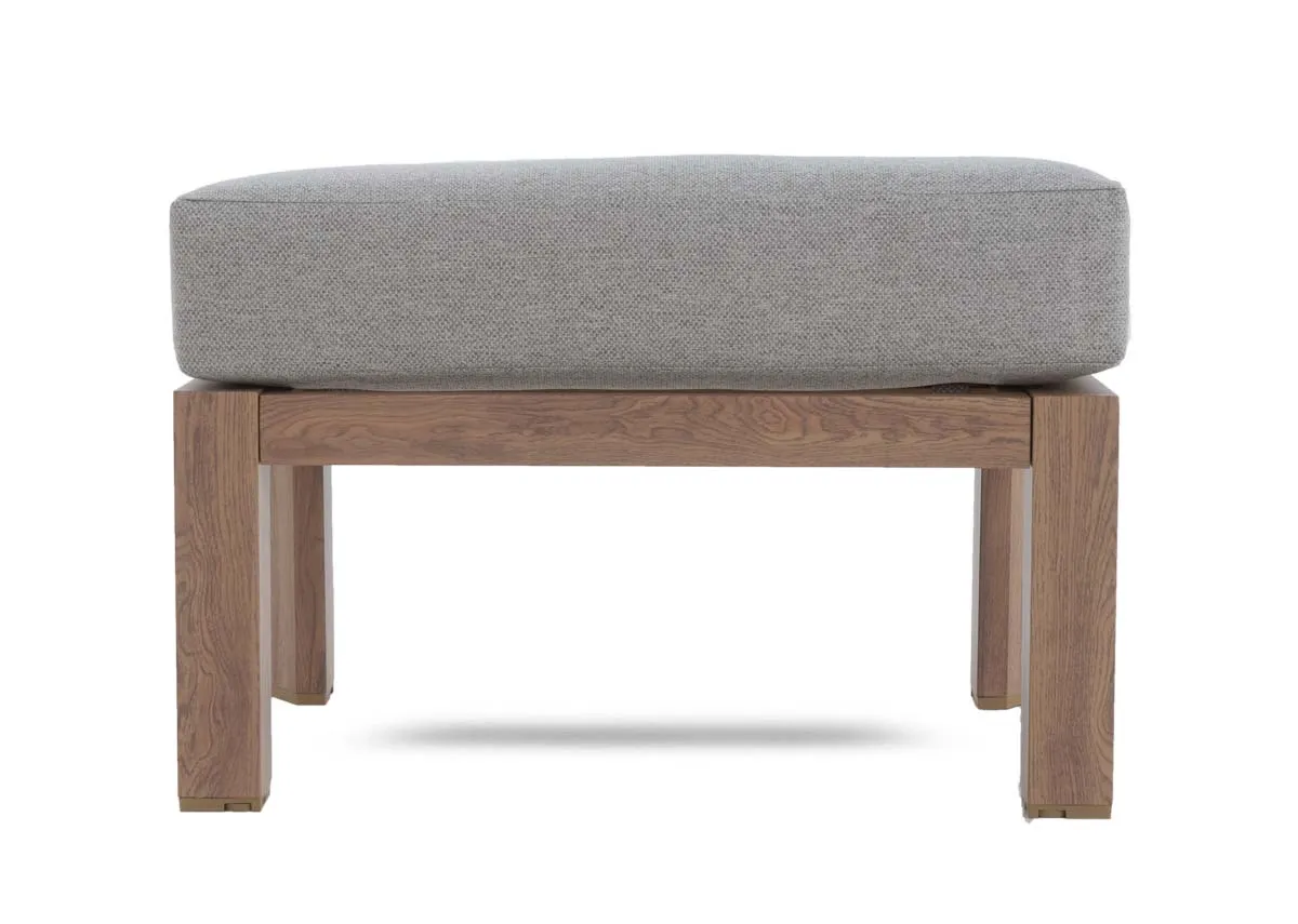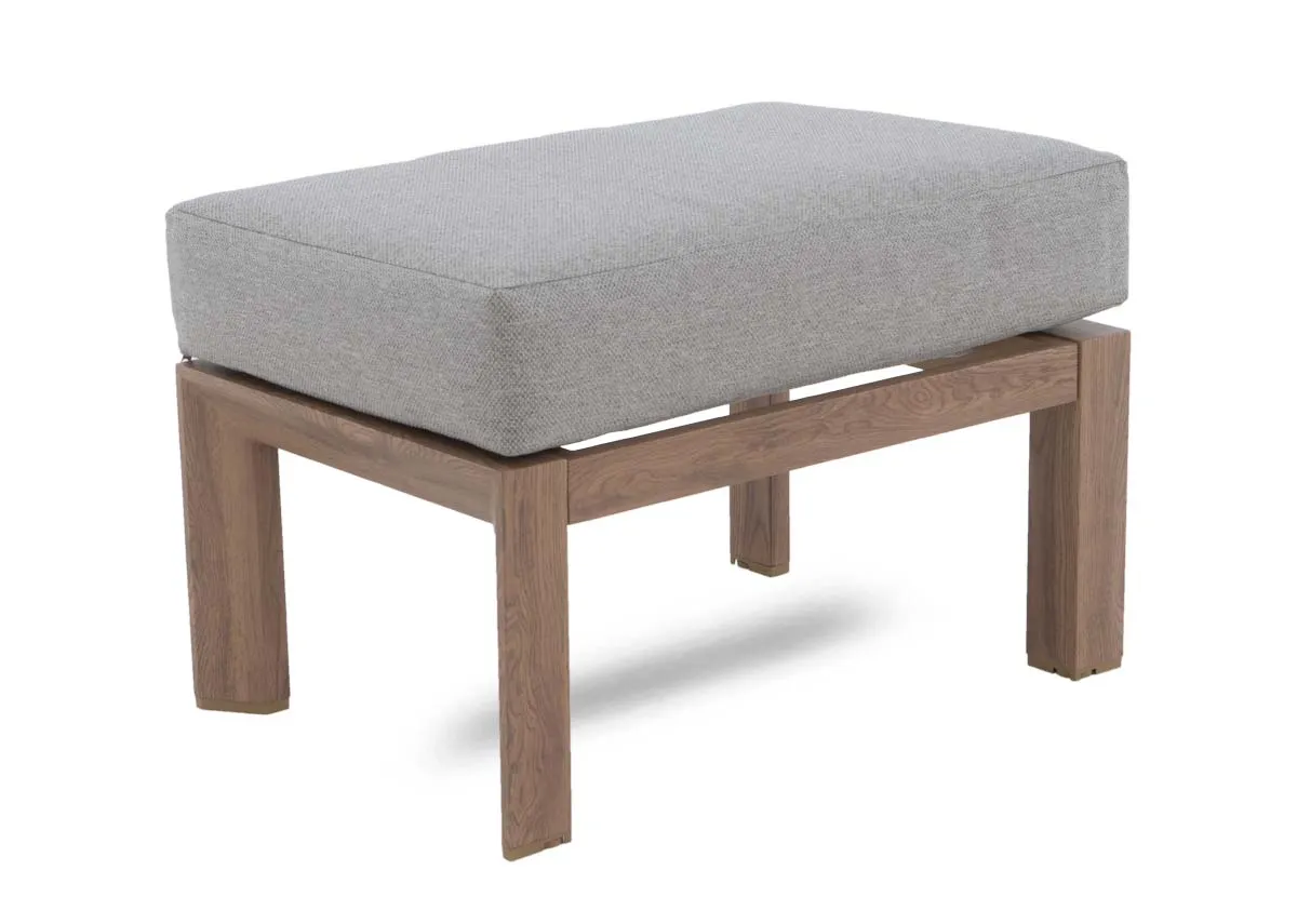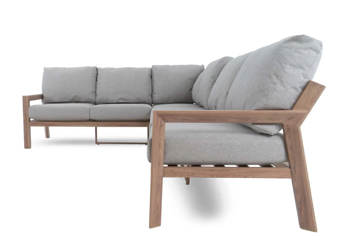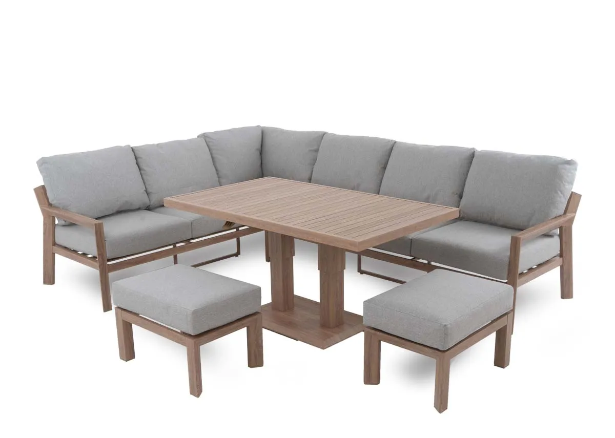 A garden corner lounge set with grey cushions on the sofa for comfort with 2 footstools for extra seating and a slatted rising dining table