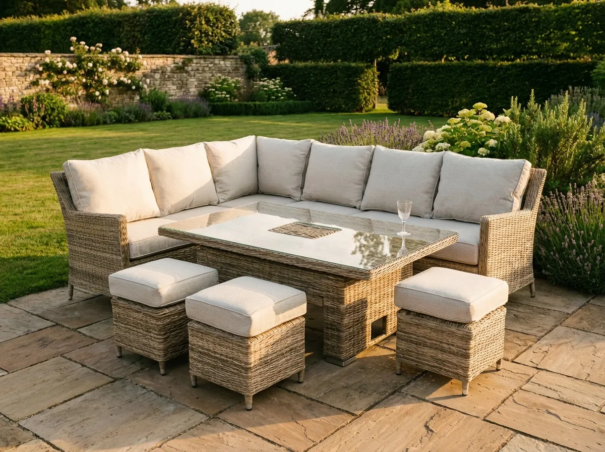 For effortless transition from casual lounging to elegant dining the Monterey Corner Garden Set features a unique glass rising table and 3 ottomans for extra diners
