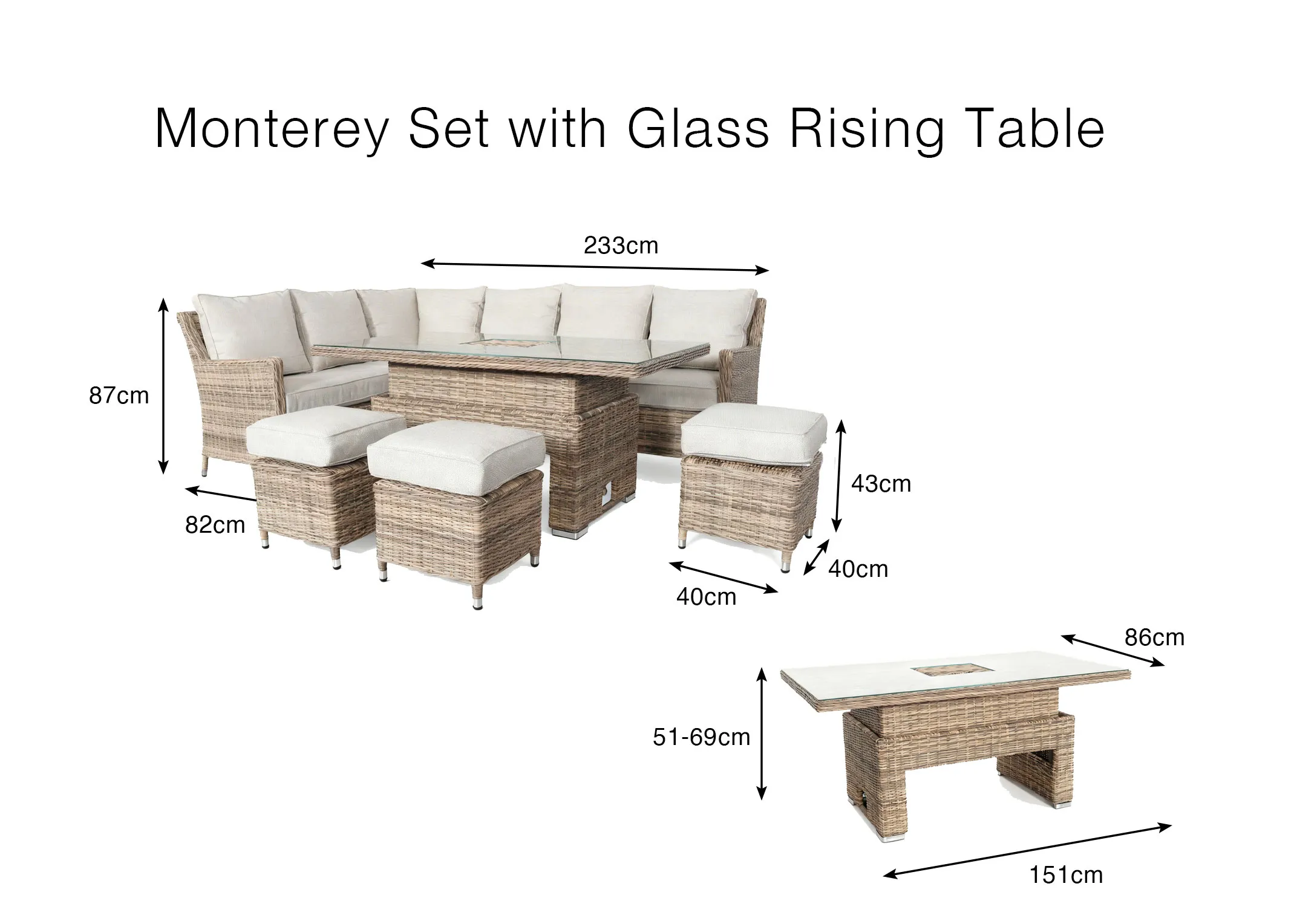 Sofa 82cm Table 86cm Stool 40cm d x Sofa 233cm Table 120cm Stool 100cm w x Sofa 87cm Table 71.5cm Stool 34cm h