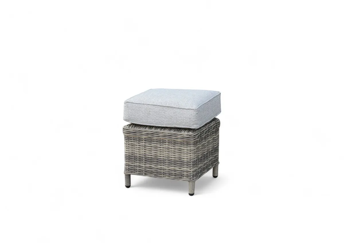 A grey & beige Outdoor corner sofa set with fireproof cushions, 3 square stools and a rising rectangular table which caters for 6-9 people.