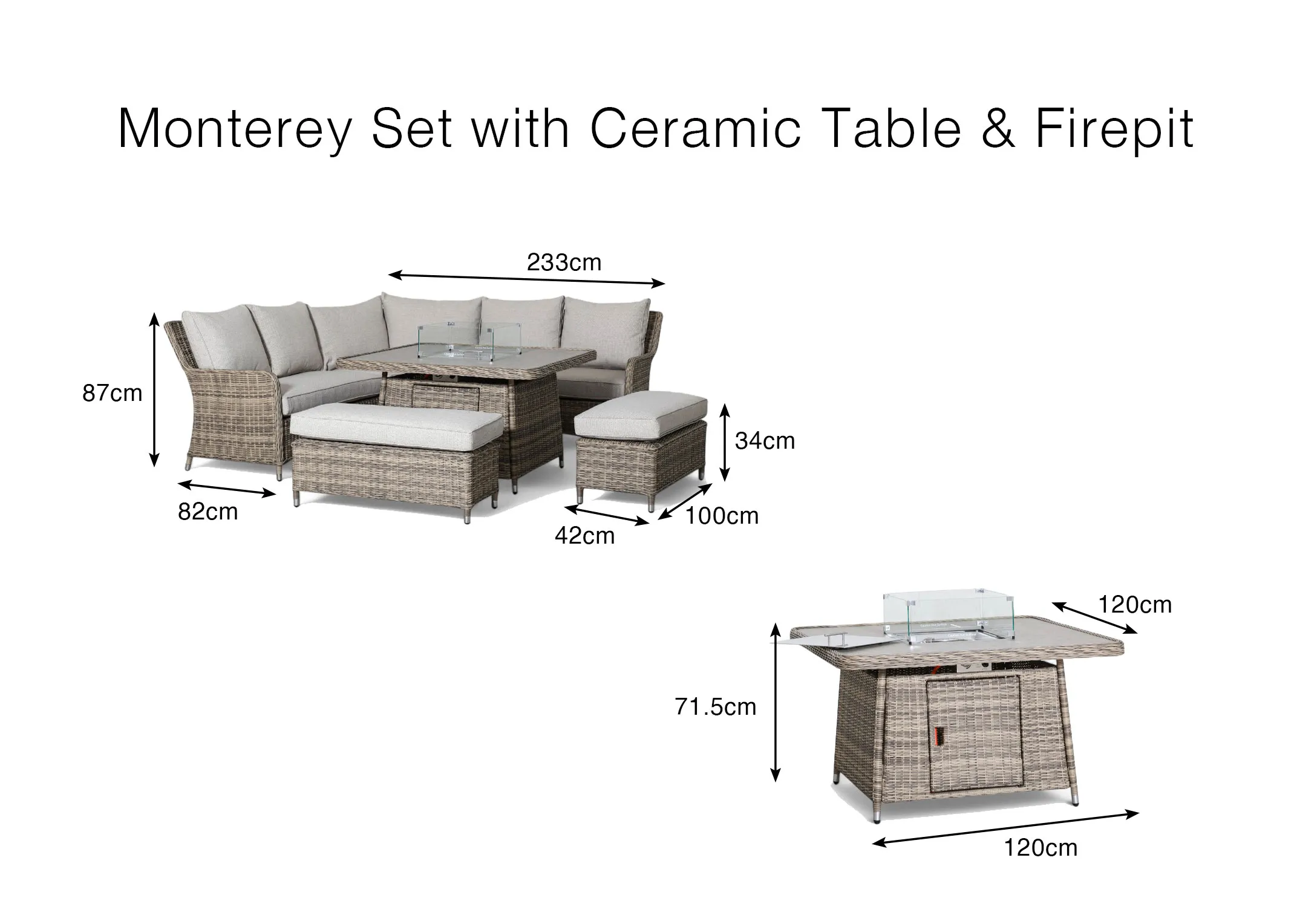 Sofa 82cm Table 120cm Stool 42cm d x Sofa 233cm Table 120cm Stool 100cm w x Sofa 87cm Table 71.5cm Stool 34cm h