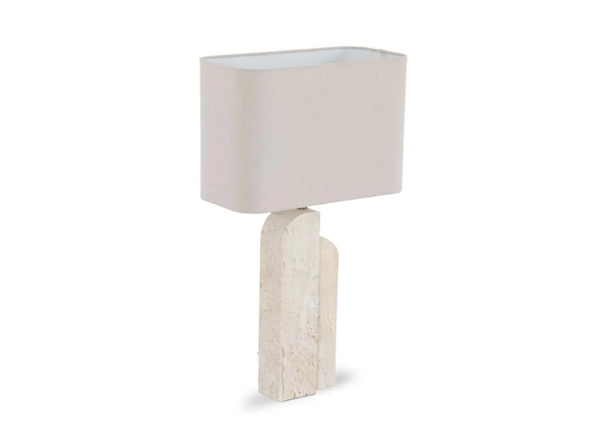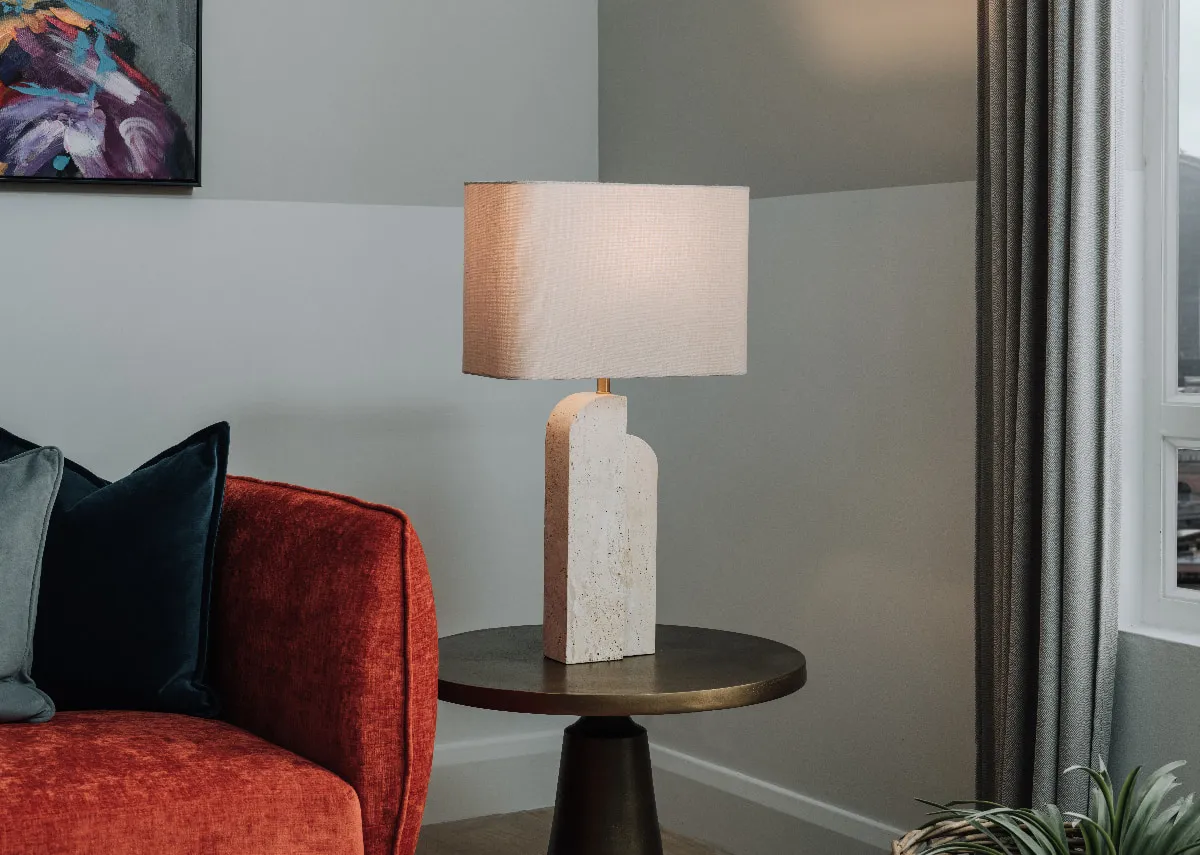 The Irvine lamp boasts a sculptural ceramic base and a memorable rectangular shade in neutral shades which combine to create a contemporary look.