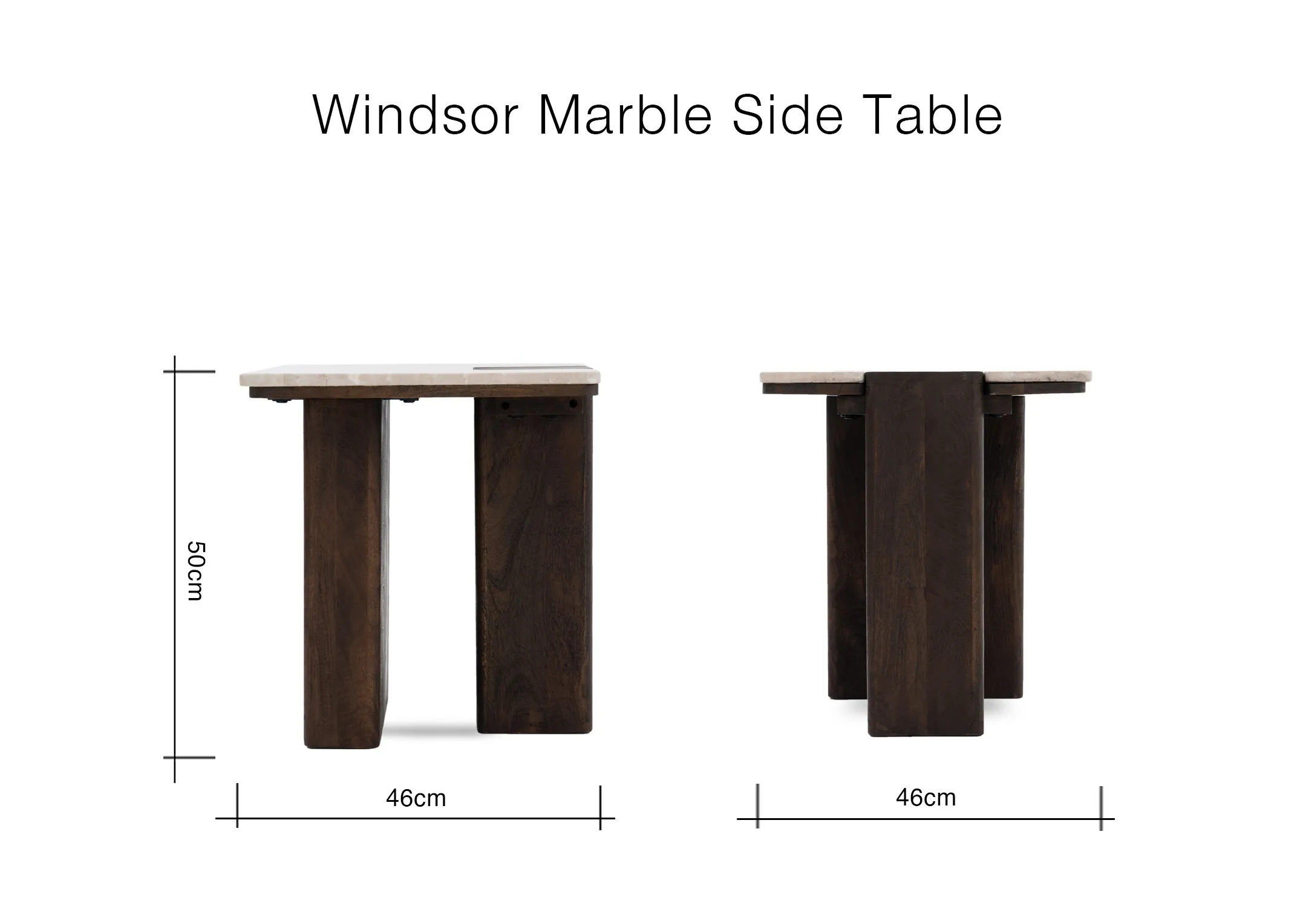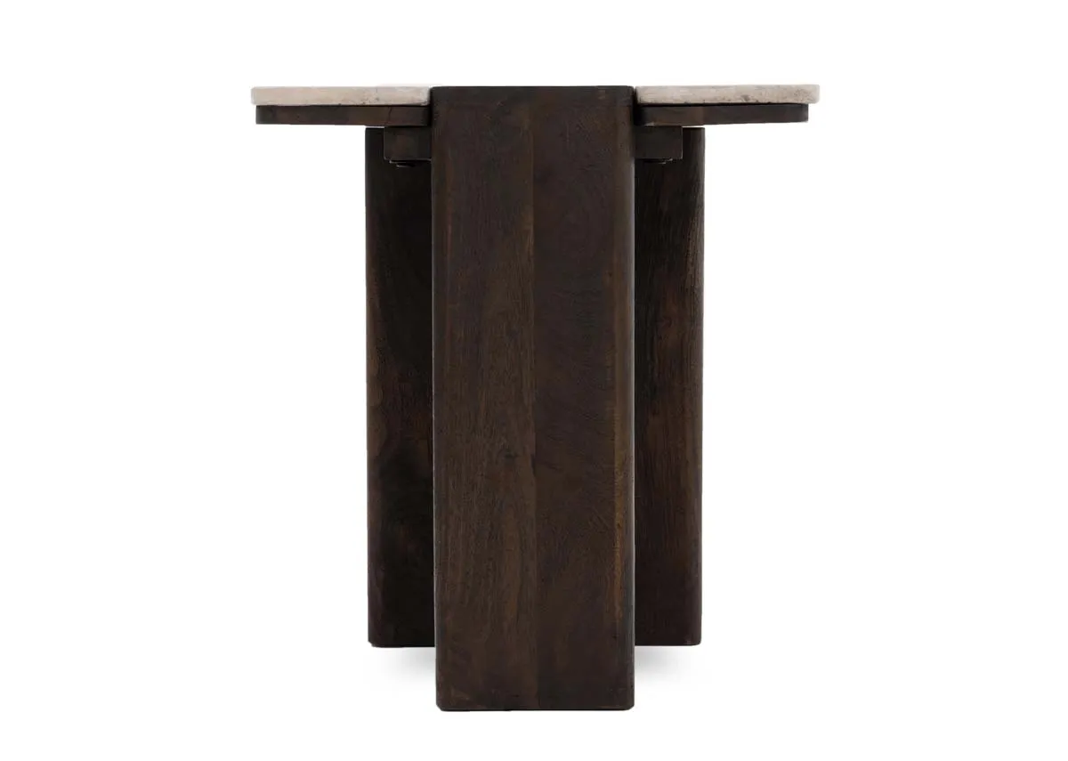 A rectangular side table, modern with cream marble top and contrasting dark wood legs, a real feature piece.