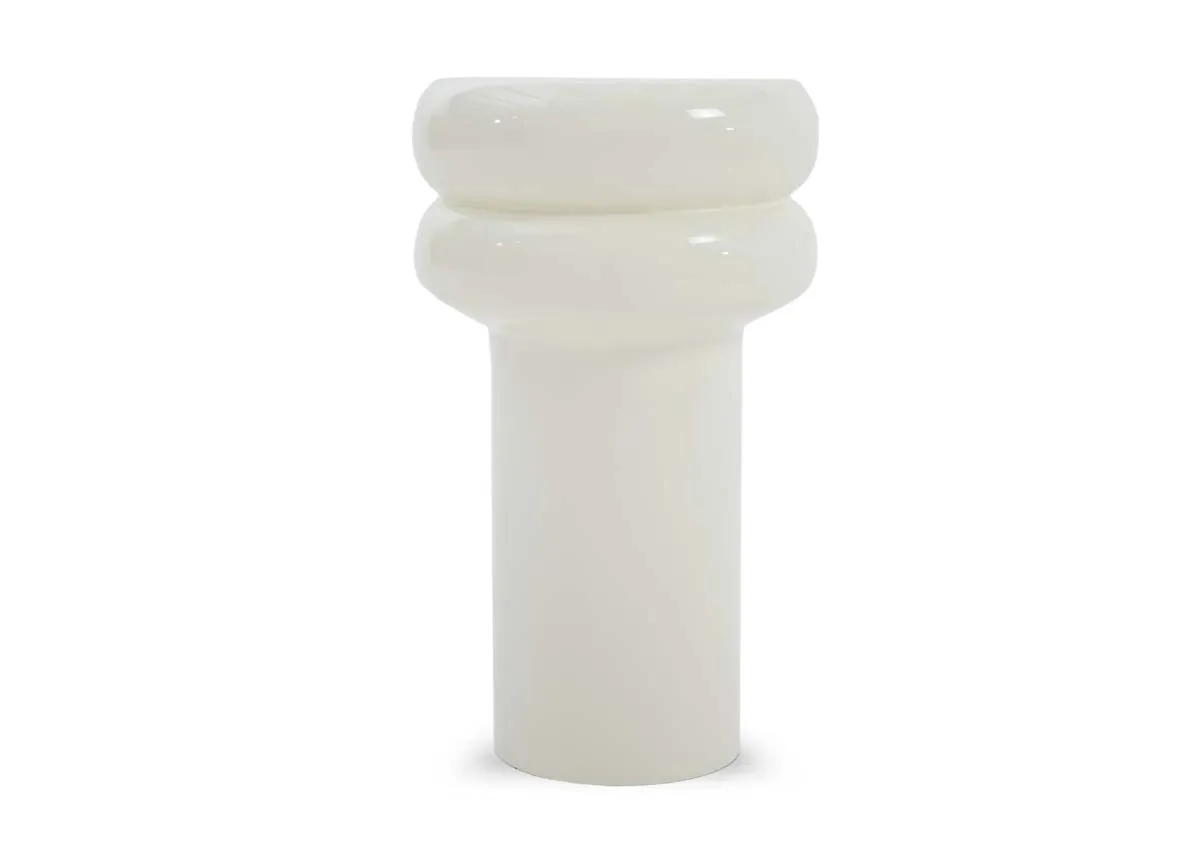 A tall pillar side table made with iron and finished in a neutral cream glossy paint, ideal for your living or bedroom.