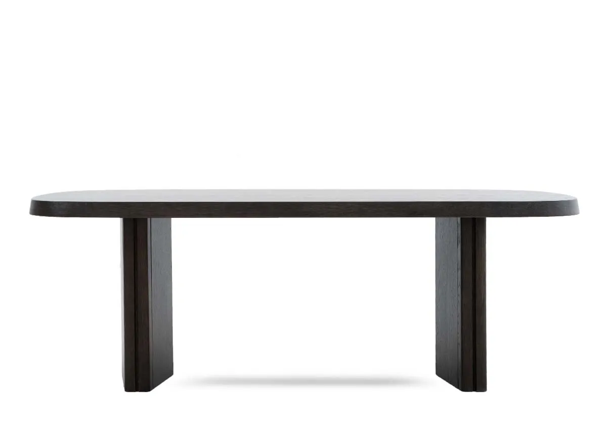 A modern style rectangular coffee table with rounded edges, a espresso brown oak veneer finish and a dark rich angular base.