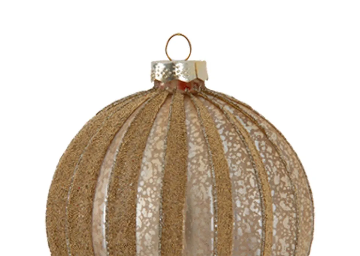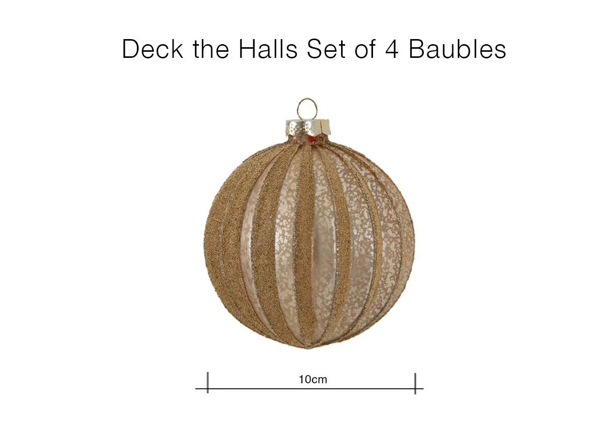 These set of four gold baubles feature a ribbed design which alternates between a distressed pattern and glitter.