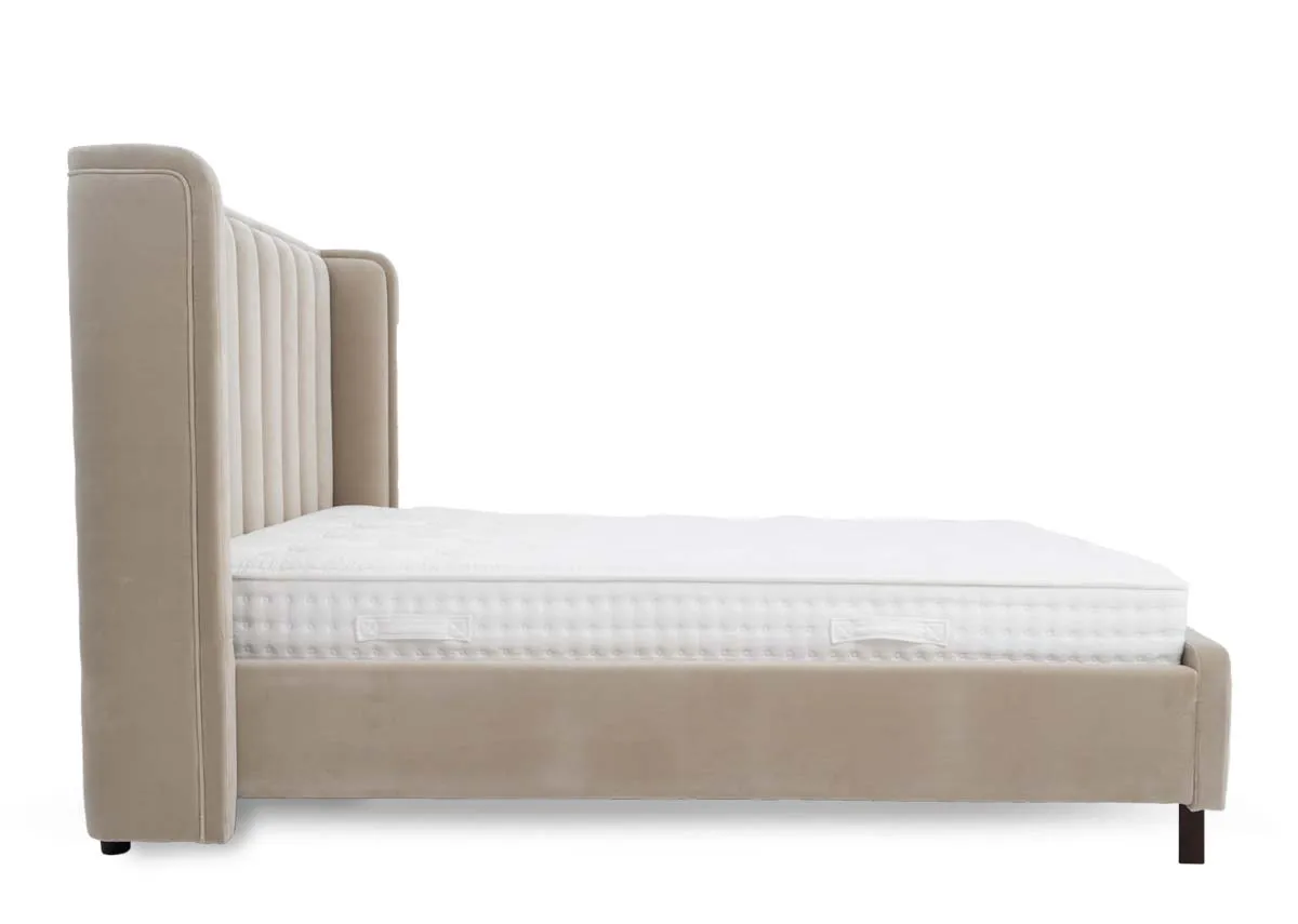 Versatile but luxurious in beige the Lowe 4ft6 bedframe boasts a padded headboard with vertical panels, offering comfort and practical style.