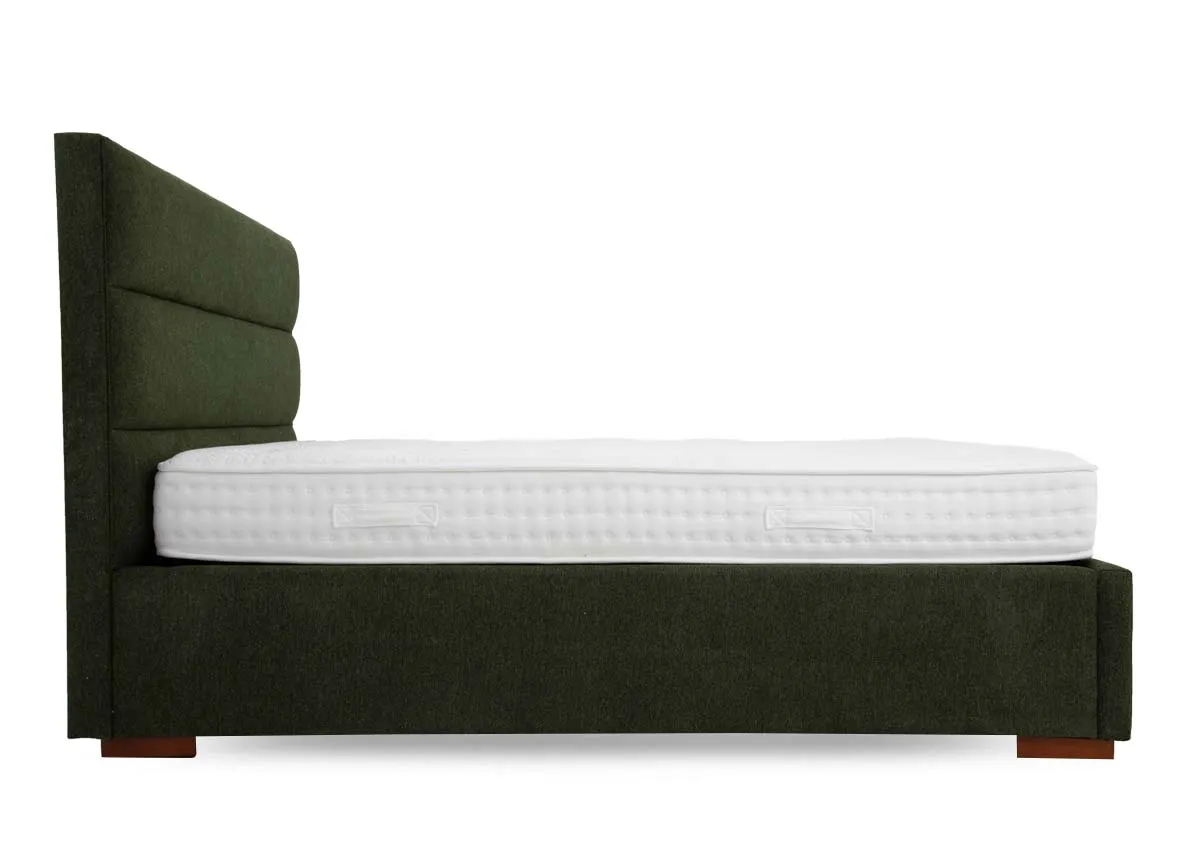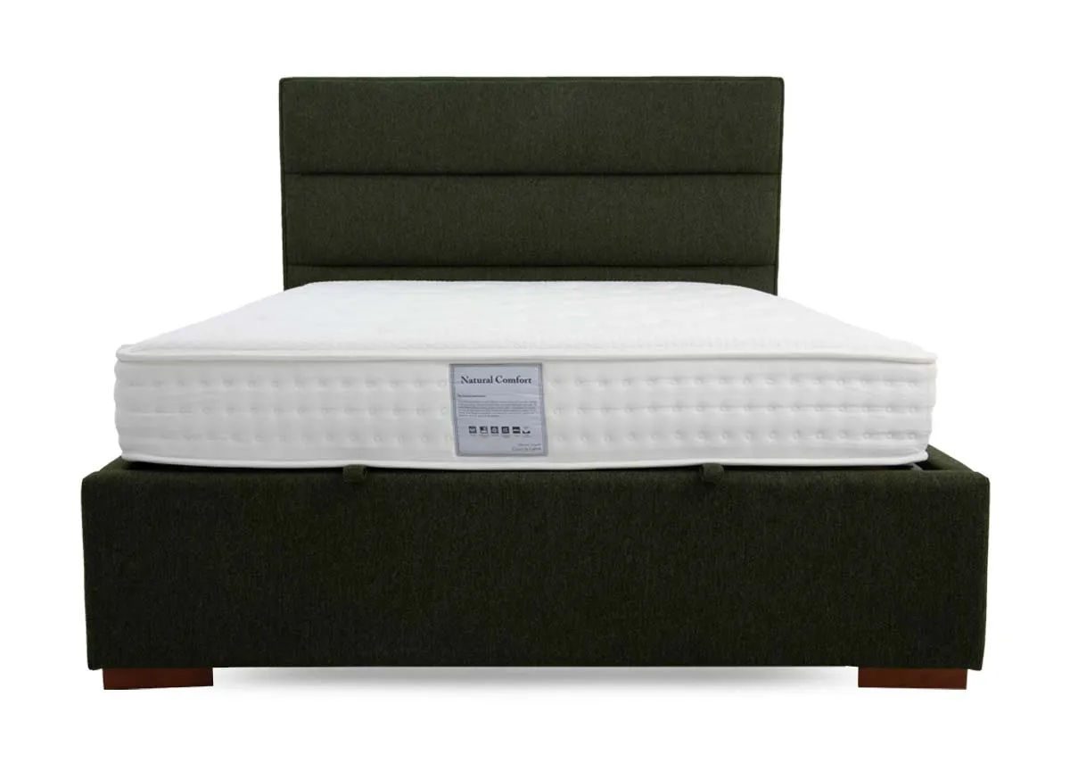 Blend functionality and stylish design with the Ebony moss green double 4ft 6 fabric ottoman, featuring a cushioned headboard and a lift-top feature concealing underneath storage space.