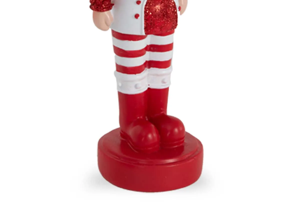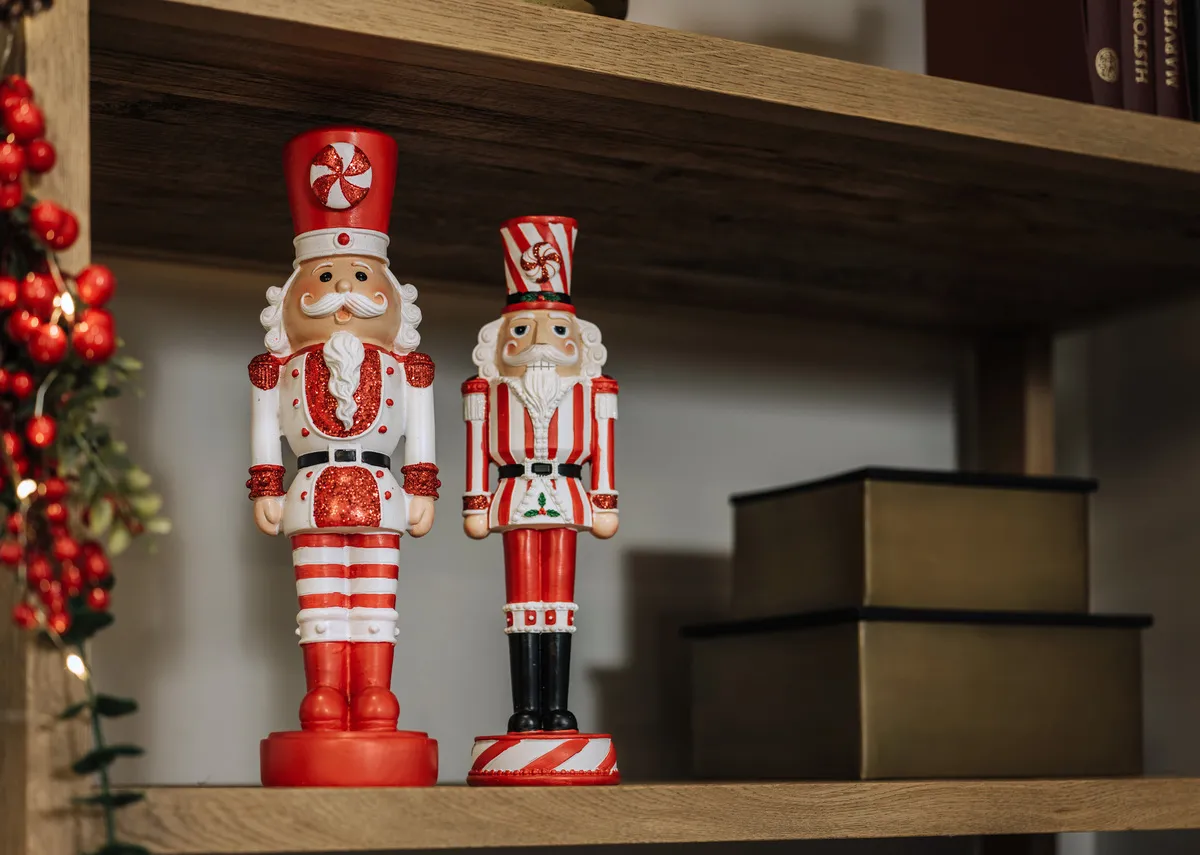 A bold red & white Nutcracker with white jacket on a red base.