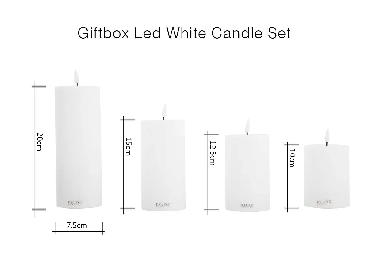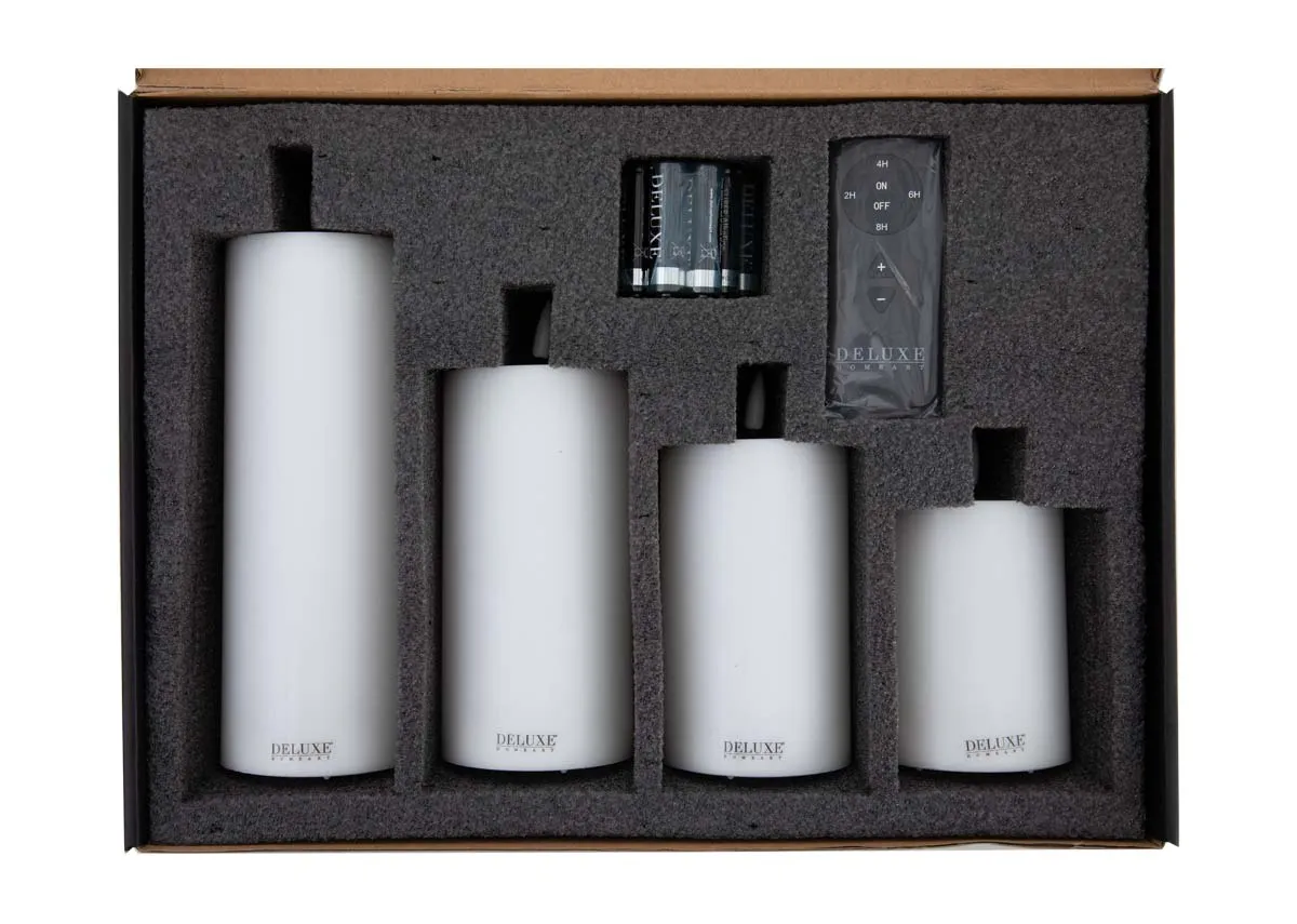 A battery operated set of four white LED pillar candles in a variety of sizes all made with a wax finish which emulates a real life like candle and remote included to activate.