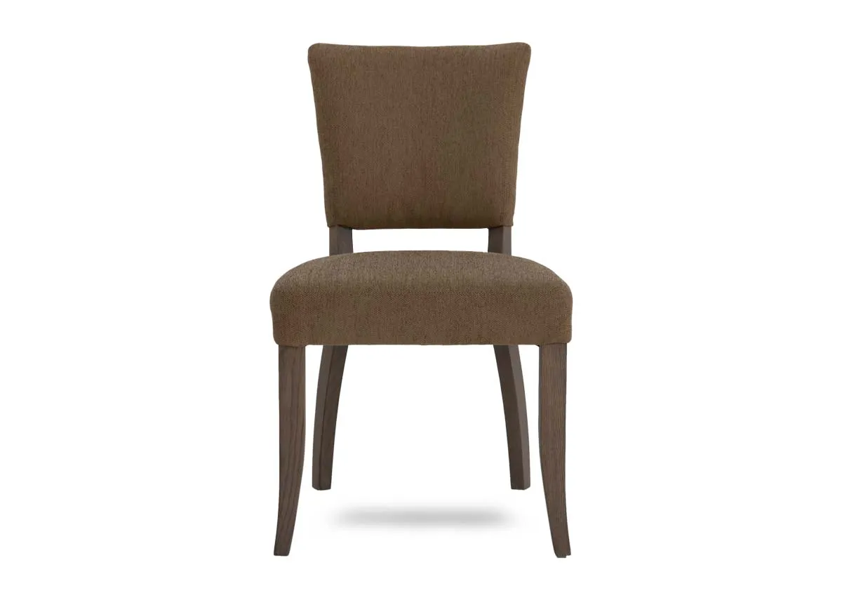 A gold herringbone fabric dining chair with foam filled seats and back with grey ash wood legs.