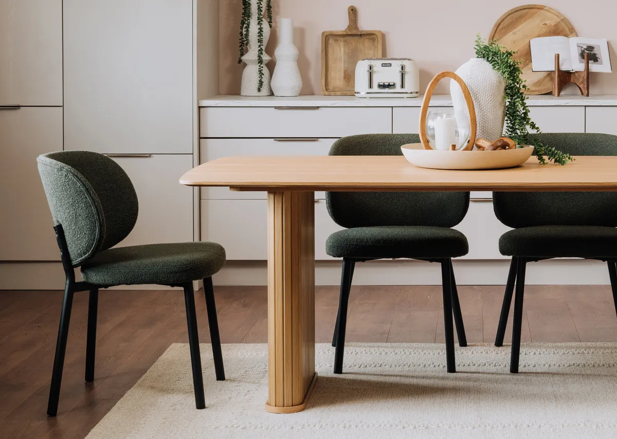 A green boucle dining chair with metal legs, versatile, comfy and oozing style.