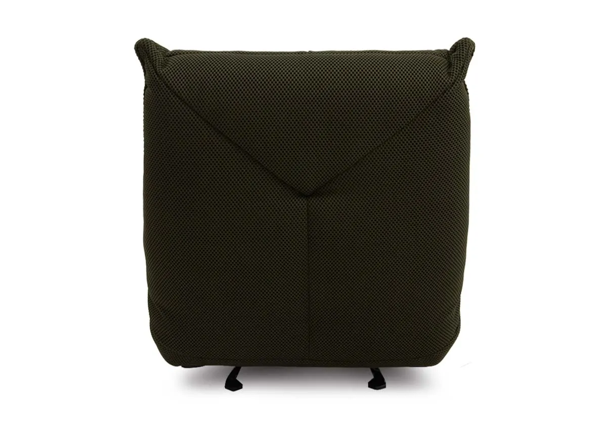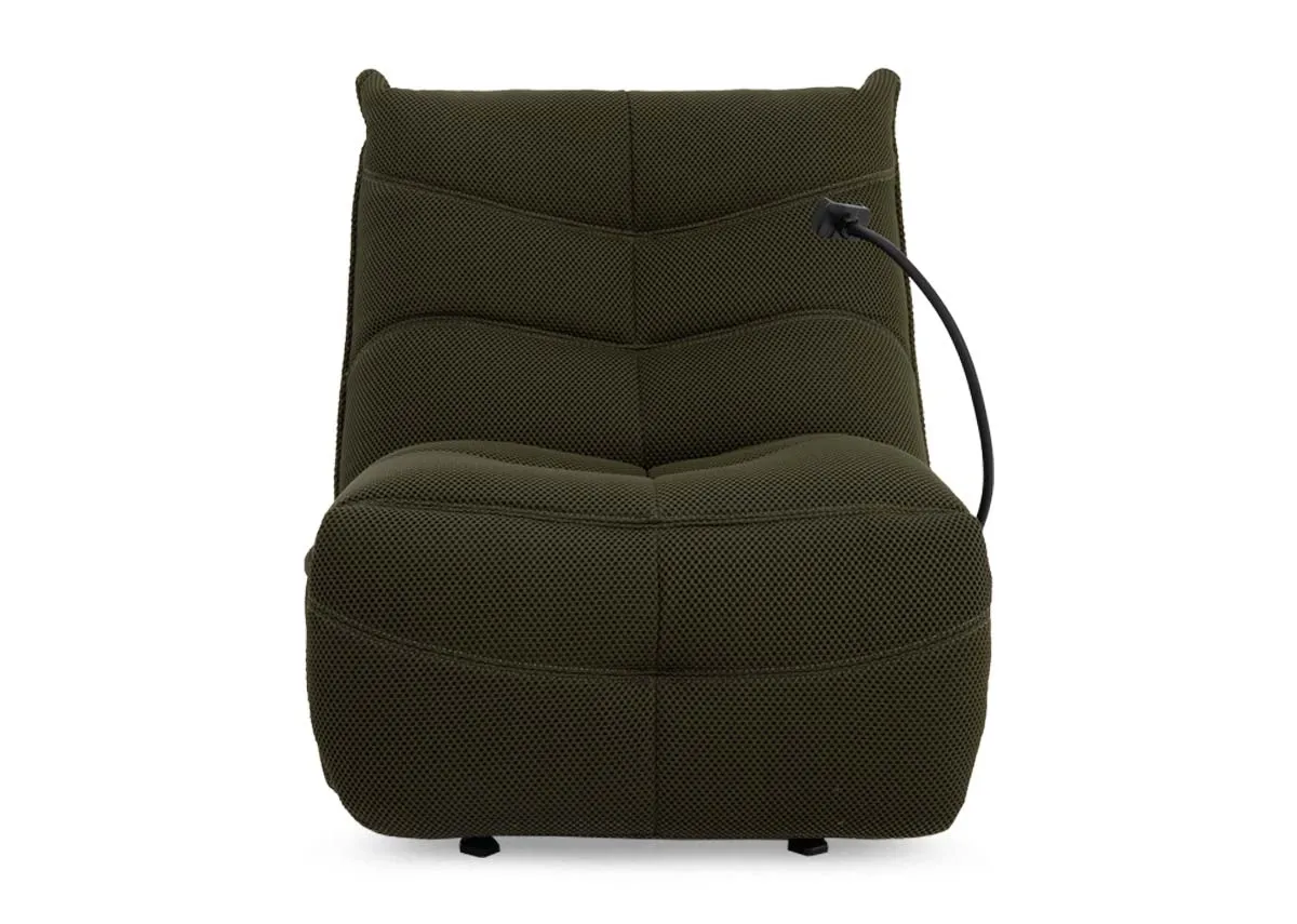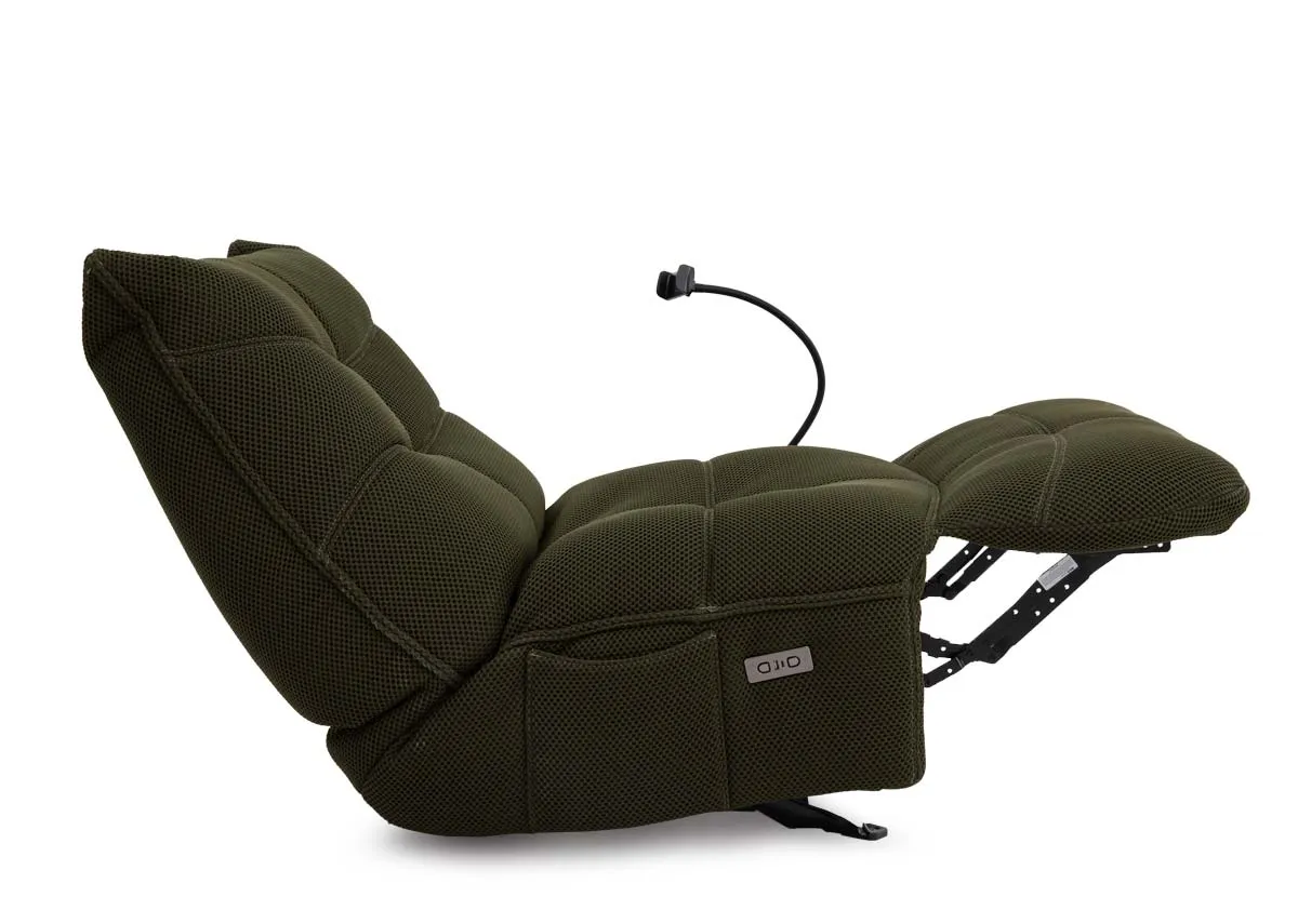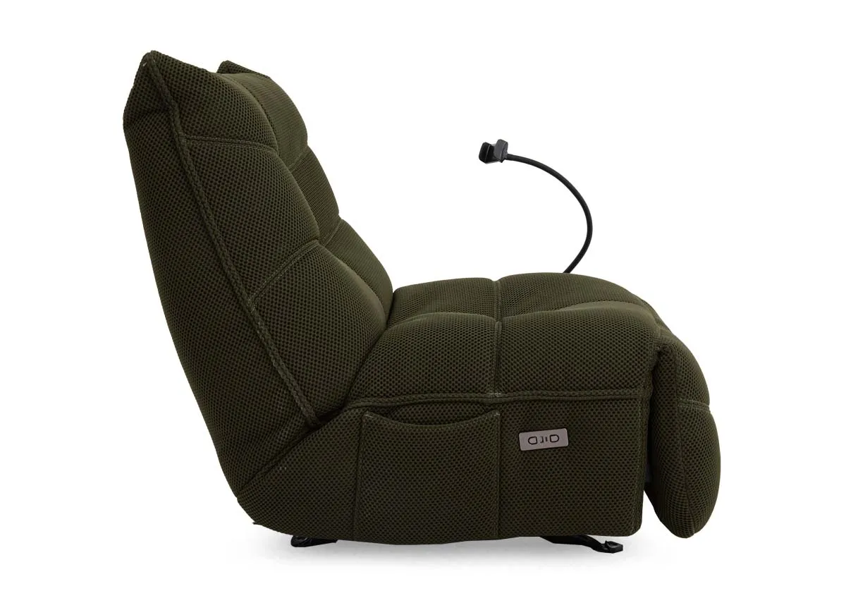 A green fabric power gliding gaming chair with thick foam filled seat for added comfort, a side pocket for remotes and handsets, usb charging port and a hands free phone holder.