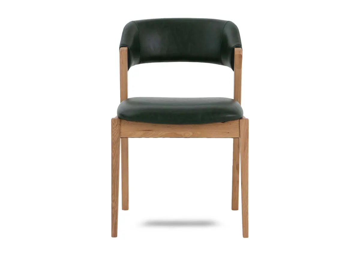 Retro in color and style the Renvyle dining chair boasts a deep green faux leather seat and wood frame, a style that would pair with most oak dining tables.
