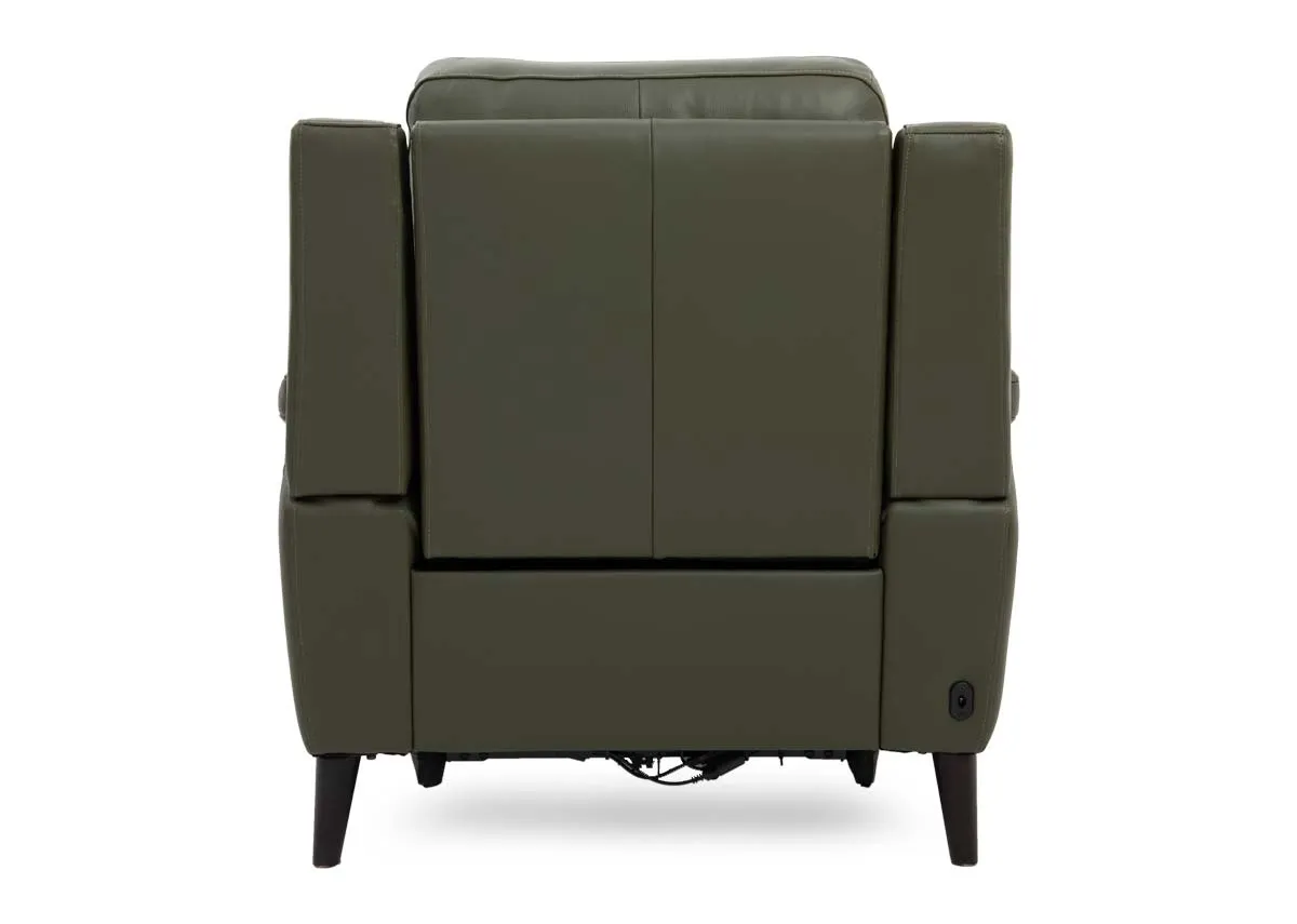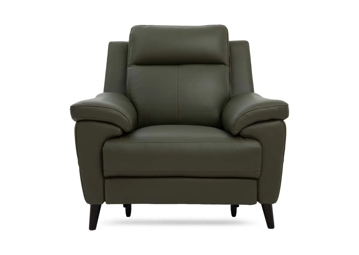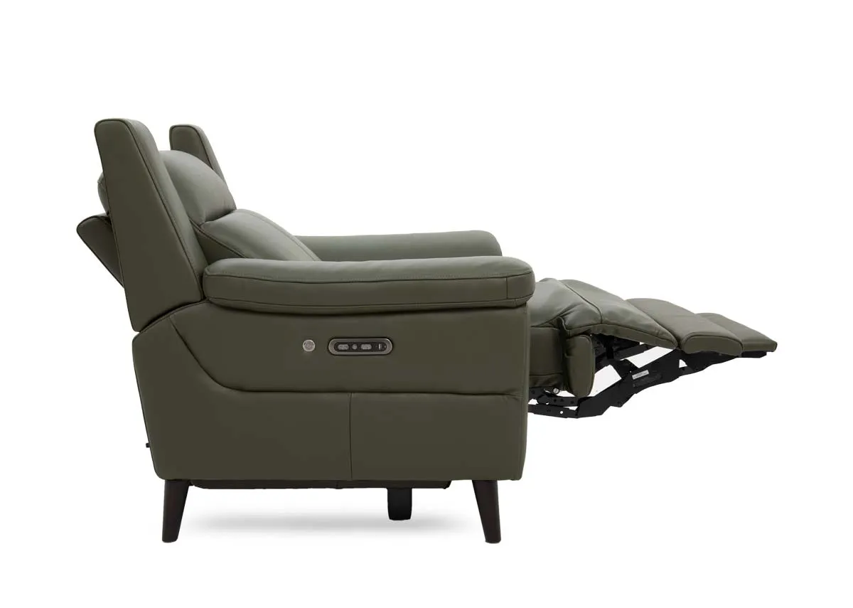 A pine green recliner armchair with rich leather upholstery, electric reclining, usb charging port & high density seats for comfort and gentle support.