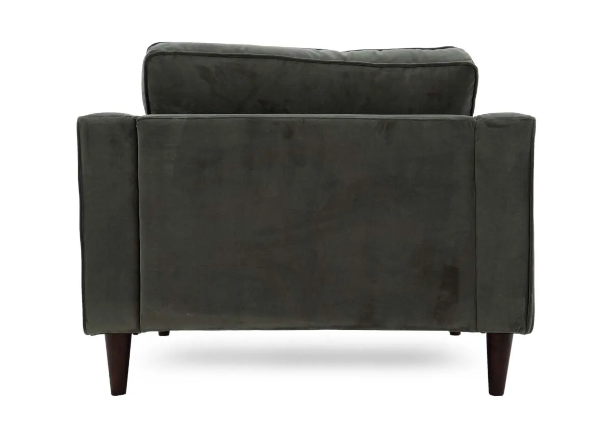 A rich green velvet fabric armchair with low back, clean lines and tufted button seat detail, 2 cylindrical bolsters all give this piece a retro feel.